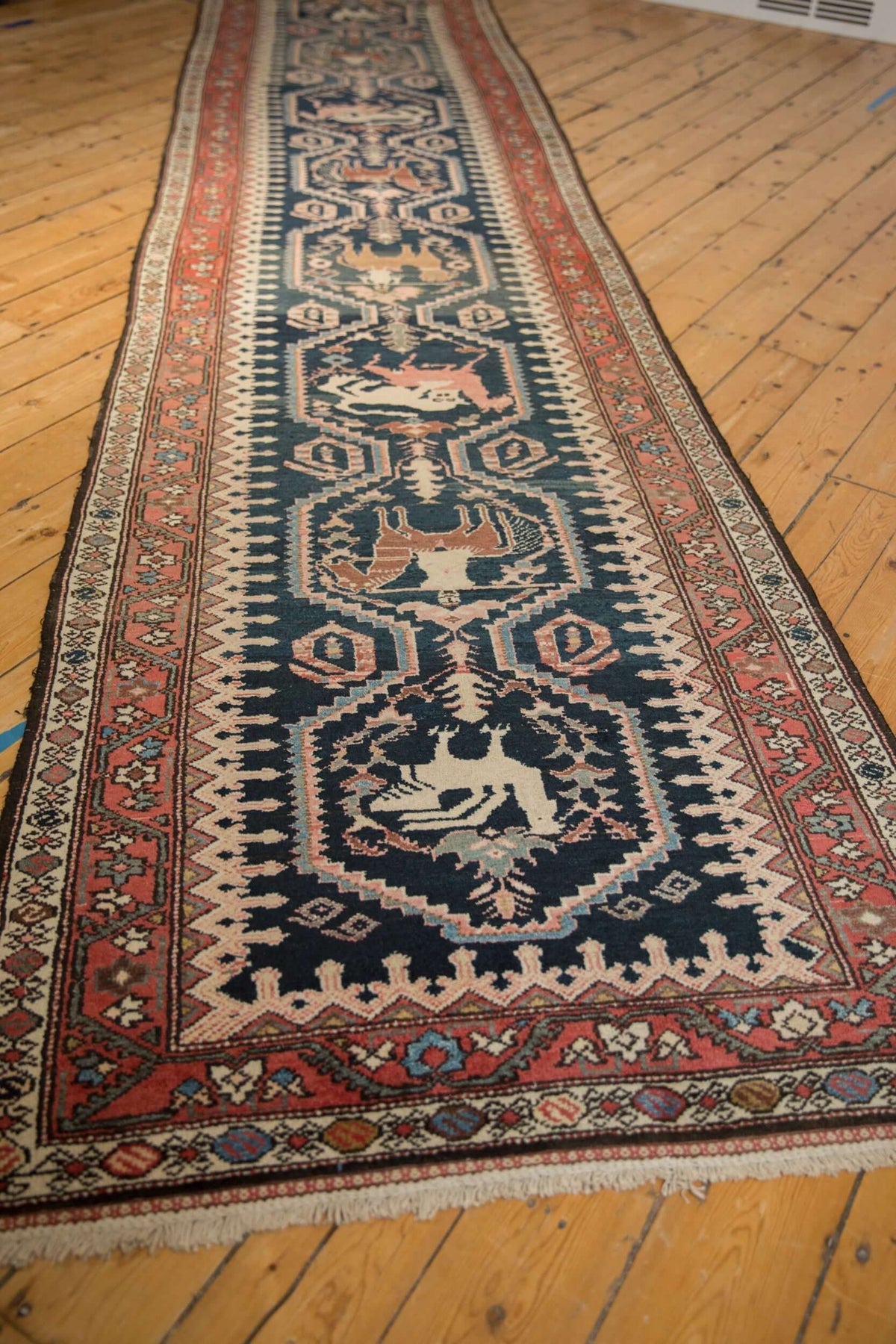 This Antique Persian Malayer Rug Runner—measuring 3’6” x 16’2”—is perfectly suited for a grand entryway, gallery, or heritage hallway. Its spirited geometry and narrative scenes make it a conversation piece that bridges artistry and storytelling. In Vintage Boho interiors, it brings grounded sophistication, complementing weathered wood, aged leather, and iron accents. The contrast of teal and terracotta tones imbues spaces with a rustic yet refined warmth, evoking the heritage of nomadic Persian design.