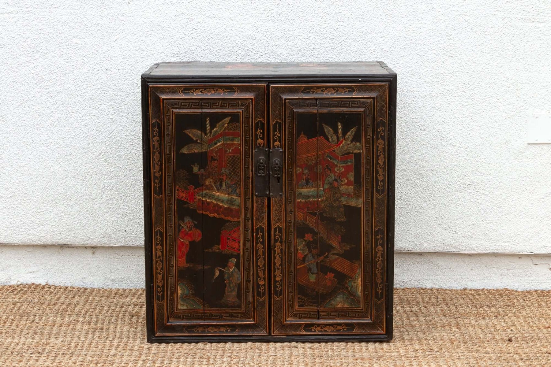 Crafted by hand during the late Qing period, this cabinet embodies the dual nature of traditional Chinese craftsmanship — the balance between art and purpose. The deep black lacquer ground, applied in multiple layers and then hand-polished to a reflective sheen, provides an elegant backdrop for its vivid pictorial narrative. Time has mellowed the surface, softening the colors into an earthy symphony of red, gold, and black, lending the piece an aura of quiet grandeur.