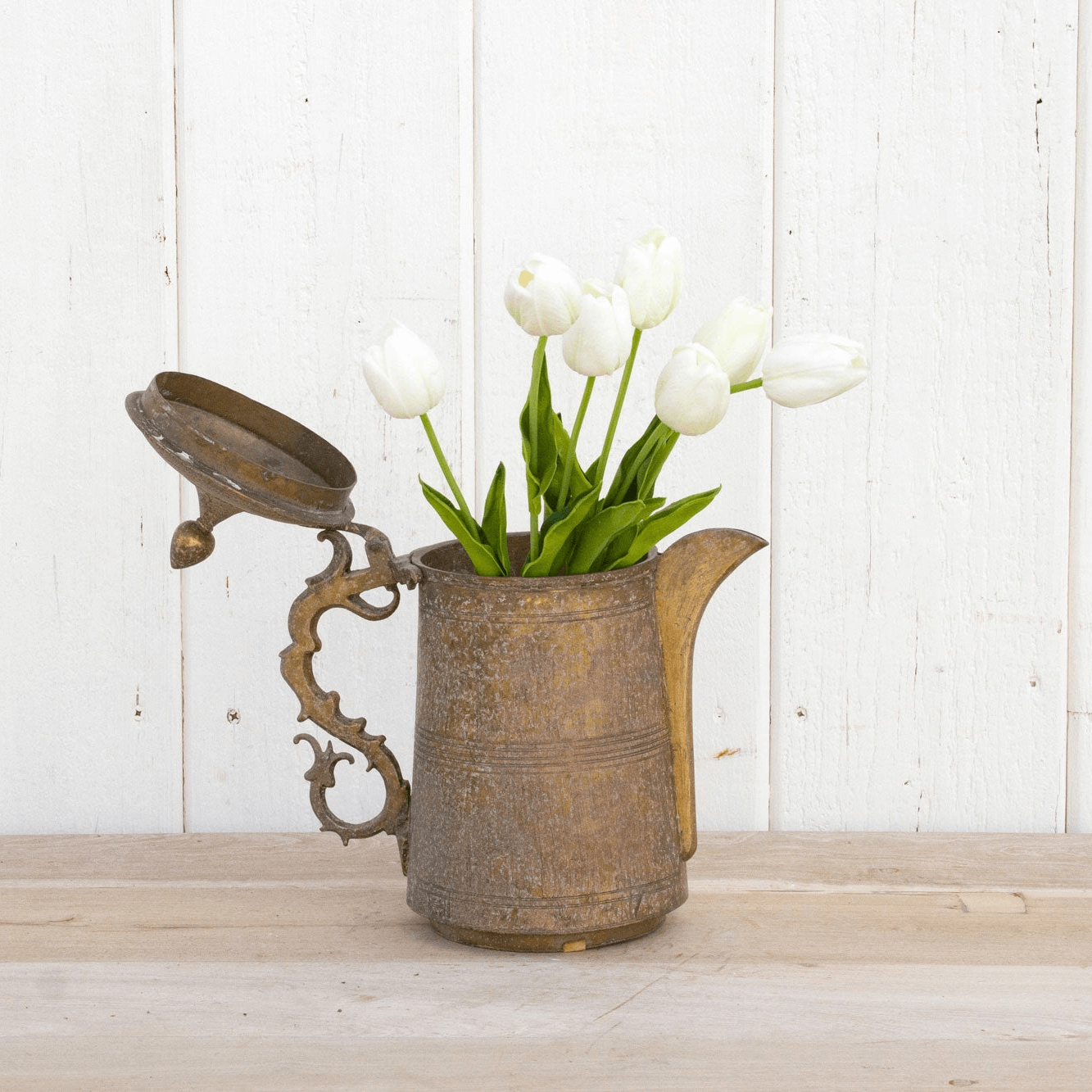 Within Vintage Farmhouse interiors, the Antique English Brass Kettle with Ornate Handle is a soulful accent that bridges function and ornament. Imagine it displayed atop a rustic pine sideboard or beside an aged ceramic basin, its metallic gleam catching the afternoon light filtering through linen curtains. In a more eclectic setting, it can serve as a striking flower vessel — the contrast between brass and soft petals creating a tableau of rural romanticism. Its presence brings with it the spirit of slow living, where the rhythm of tea, warmth, and conversation defines the home.