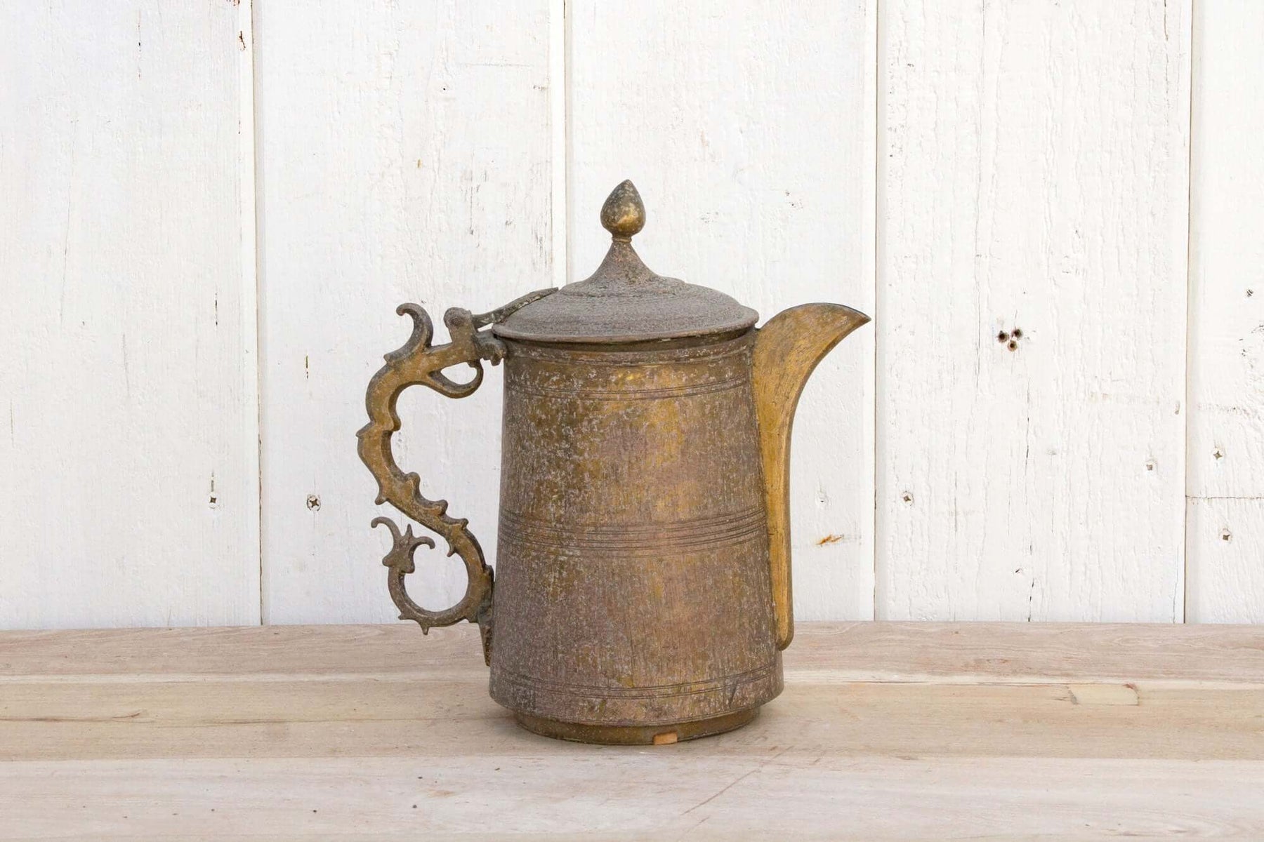 The craftsmanship speaks to a time when even the simplest household items were built with pride. The body bears fine incised lines around its middle, lending subtle texture and rhythm. The lid fits snugly, and the handle, though intricate, feels sturdy in hand — evidence of the artisan’s thoughtful balance of beauty and practicality. The natural oxidation of the brass has given it a muted, matte glow, reminiscent of candlelight on an autumn evening.