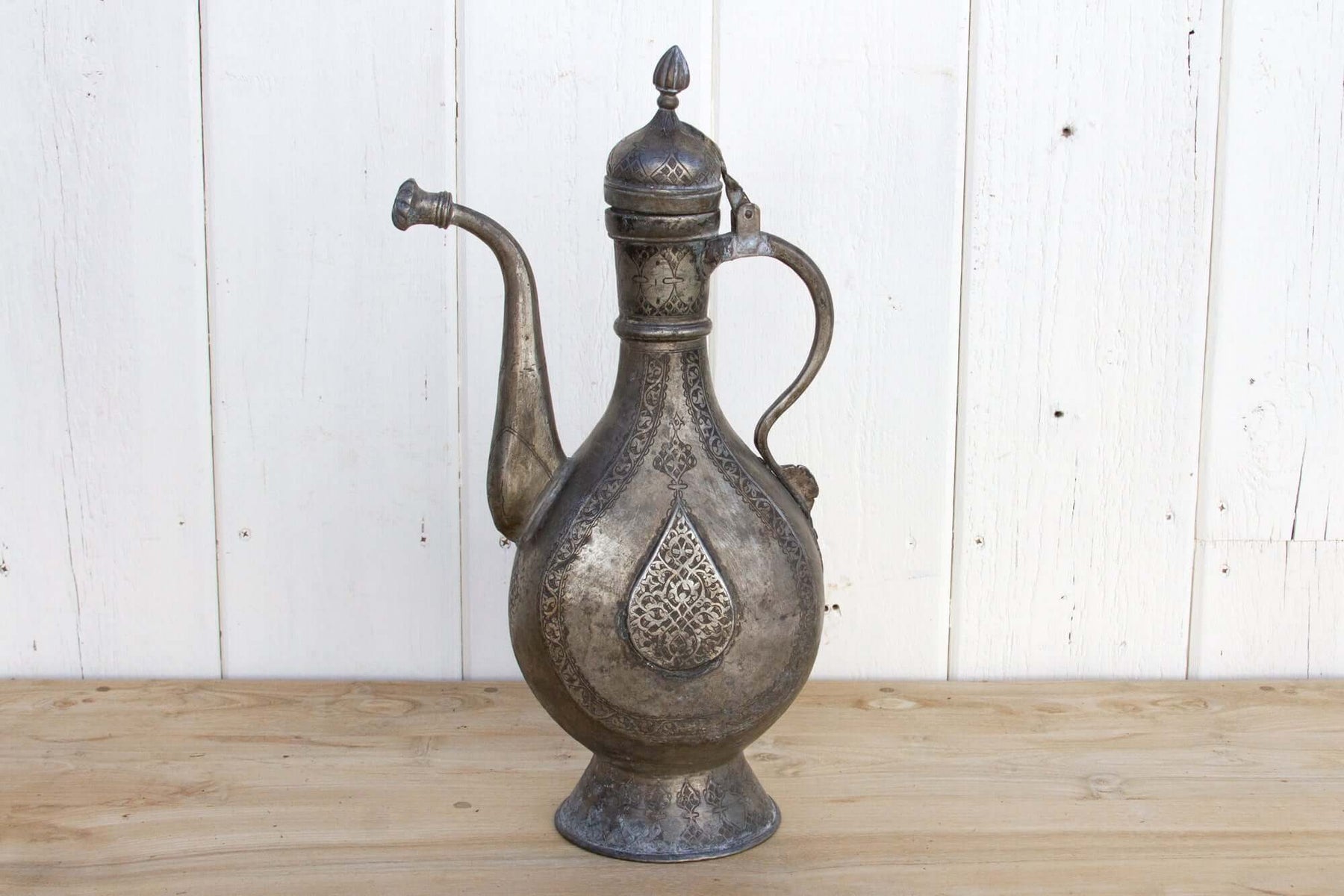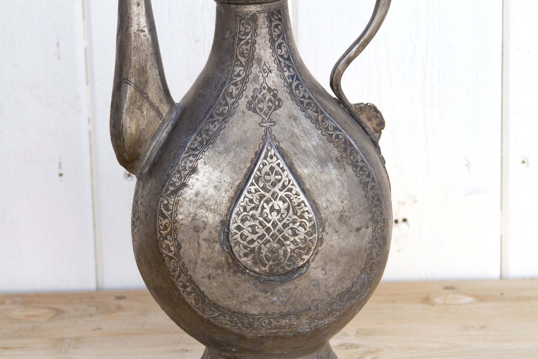 The ewer’s tactile quality invites close appreciation. The engraved patterns catch light in subtle ways, while the cool touch of oxidized metal contrasts beautifully with the warmth of wood or fabric surroundings. Its form — curving, balanced, and proportionate — carries a natural elegance that makes it both artifact and artwork.