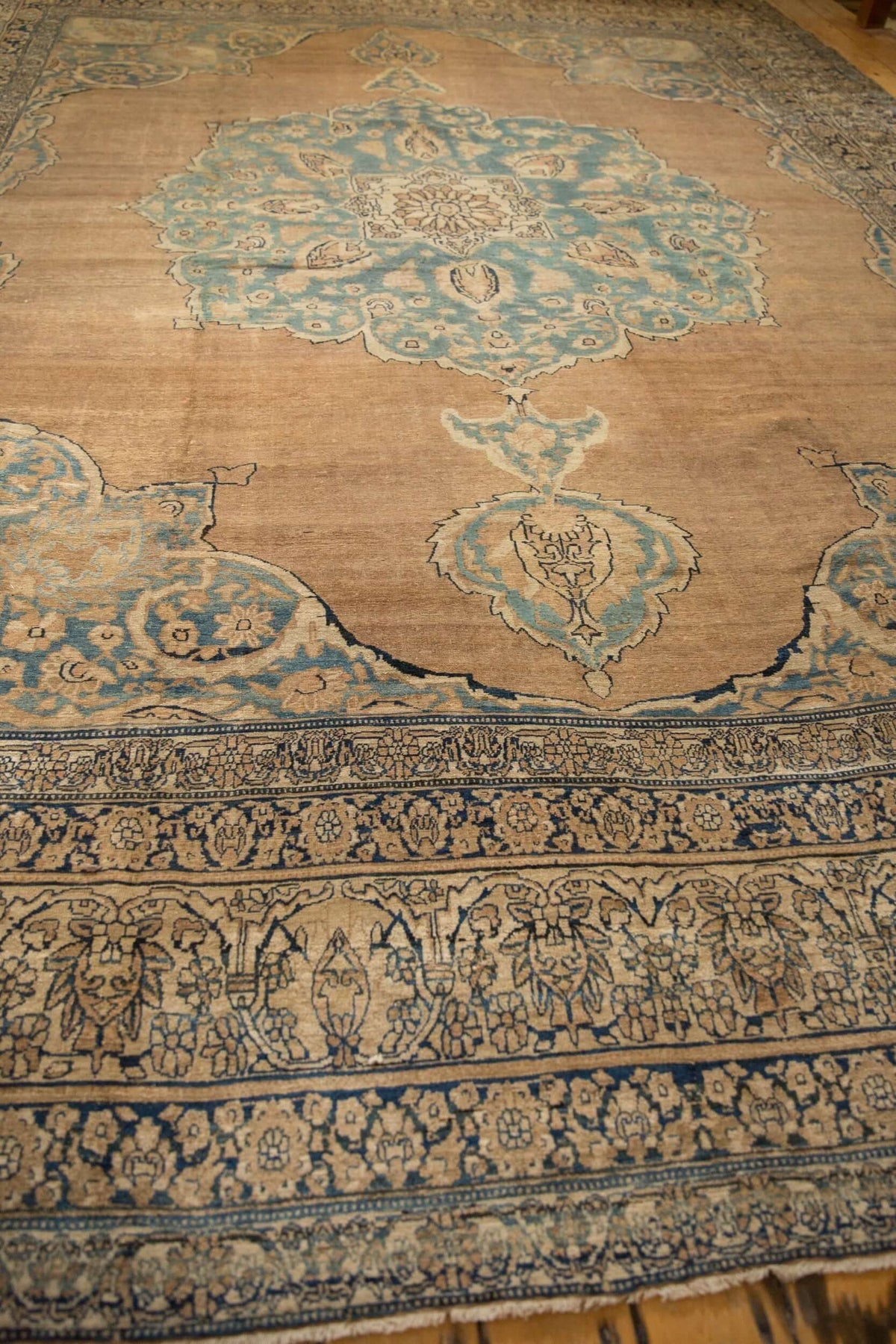 The Antique Tea Washed Persian Kerman Carpet with Oversized Medallion is a breathtaking testament to early 20th-century Persian artistry—a handwoven heirloom that has aged with grace and quiet grandeur. Woven circa 1910 in the celebrated weaving city of Kerman, this expansive 11x14-foot carpet embodies the refined aesthetic for which Persian Kermans are renowned: lyrical symmetry, botanical fluidity, and a palette softened to perfection through time and tea-washing.