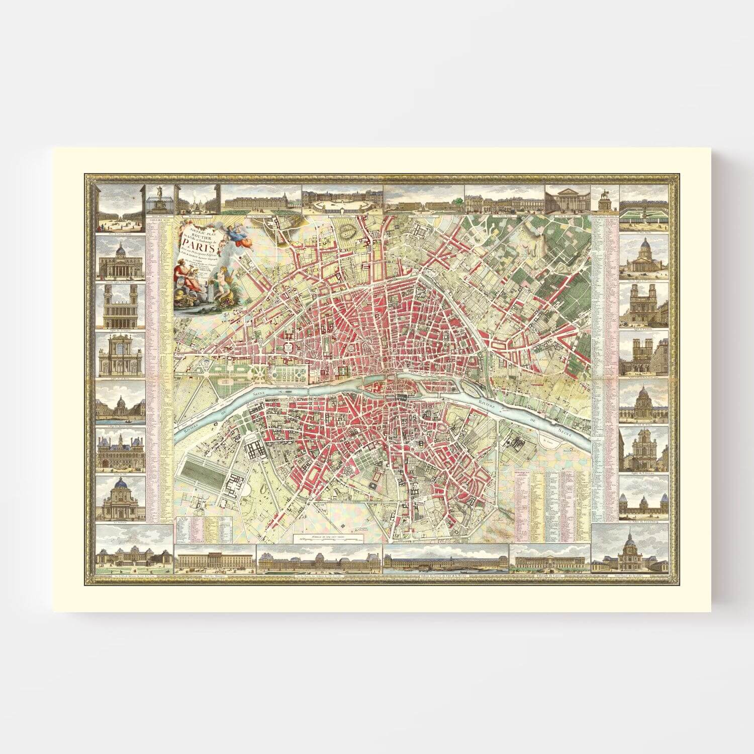 Every line and contour has been meticulously revived to honor the craftsmanship of the original French cartographer. The delicate red tracings of old Paris’s arteries contrast gently against aged ivory tones, creating a visual poetry that feels both historic and timeless. Around the map’s border, charming architectural vignettes depict the city’s beloved landmarks — from the Hôtel des Invalides to the Louvre — forming a narrative frame that captures the very soul of Paris.