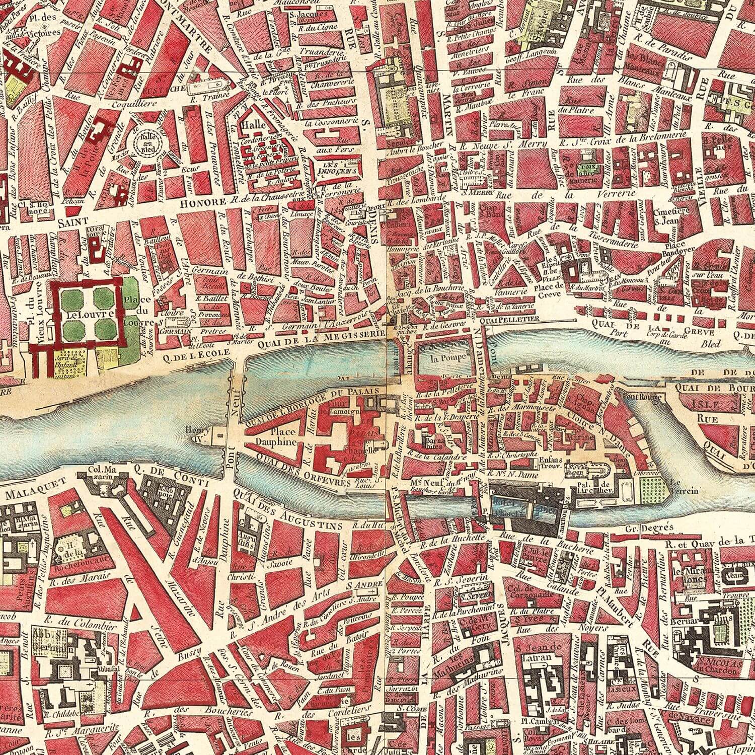 The Antique Paris Map Print from 1784 invites you to wander through the heart of 18th-century Paris — a time when boulevards were still cobbled, carriages traced the Seine, and the city pulsed with the grace of the Enlightenment. This beautifully restored reproduction preserves the intricate artistry of the original engraving, revealing the city’s elegant geometry in exquisite detail: winding streets, grand palaces, and the rhythmic flow of the river that still defines the City of Light.