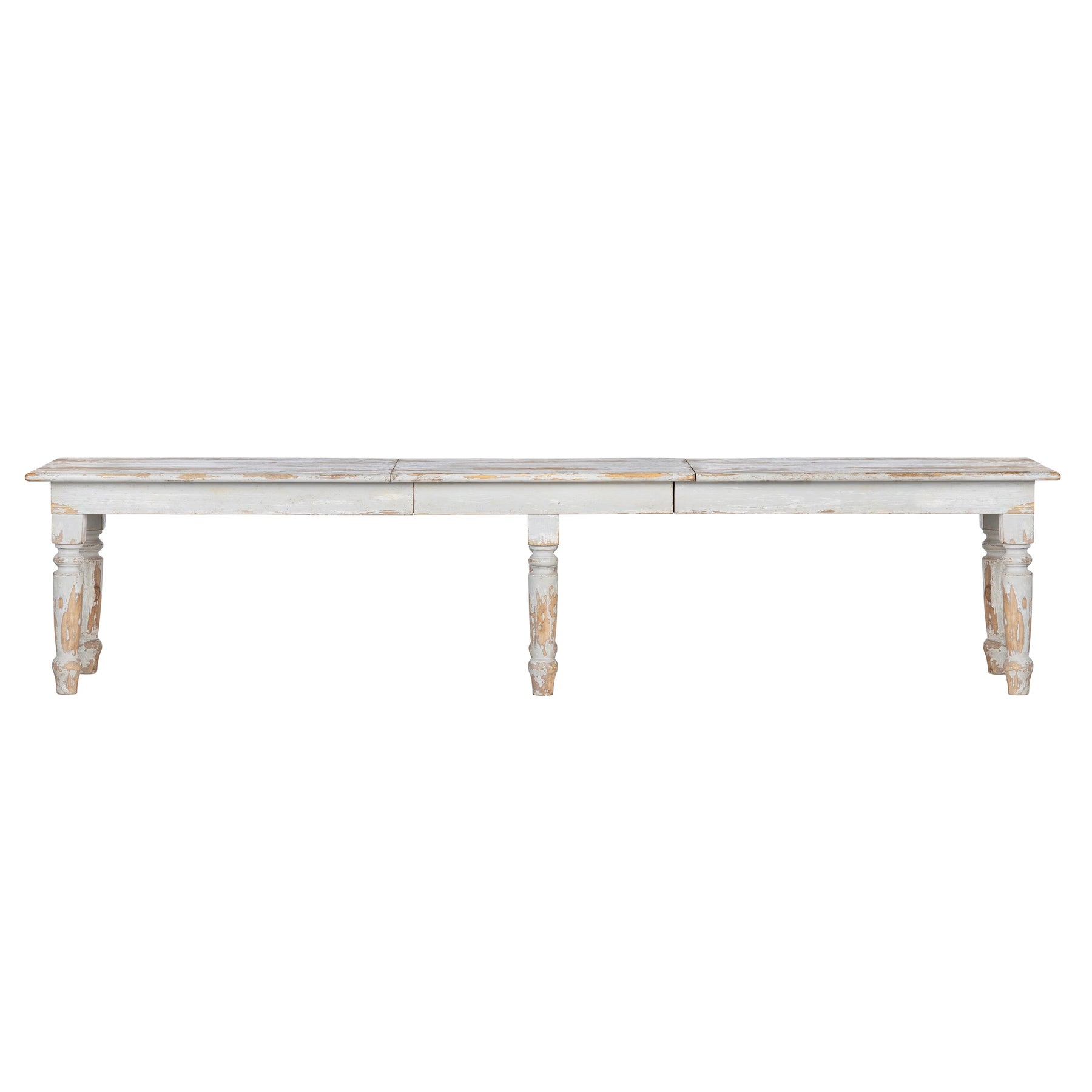 Bathed in the gentle charm of timeworn beauty, this Extra Long Antique White Farmhouse Dining Table recalls the warmth of family gatherings from generations past. Crafted from solid wood and finished in a softly distressed antique white, its surface bears the tender marks of history — the faint grain beneath the aged paint, the whisper of weathered edges that speak of laughter and shared meals. Measuring an impressive twelve feet in length, it invites both intimacy and abundance, offering space enough for a feast and the memories that follow.