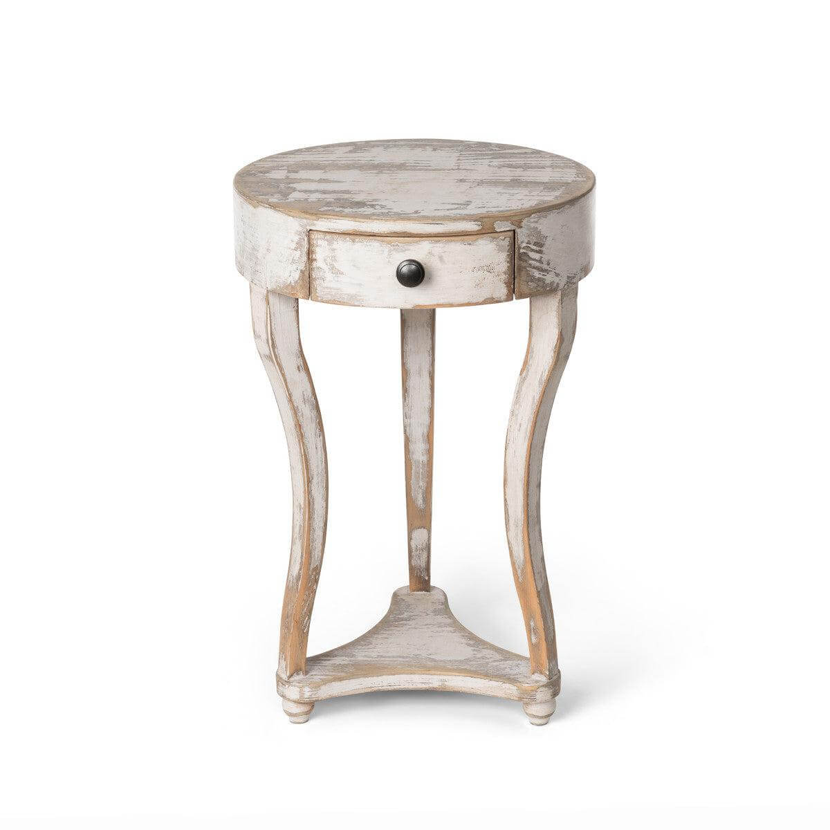 The French Country Round Accent Table with Drawer captures the soft romance of provincial living — a graceful echo of a time when craftsmanship and charm were woven into every detail of the home. Hand-finished in an antique white wash over warm pine wood, this table exudes a gentle patina that speaks of age, sunlight, and stories passed down through generations. Its delicately curved legs, reminiscent of the cabriole forms found in 18th-century French cottages, lend it a refined yet inviting silhouette.
