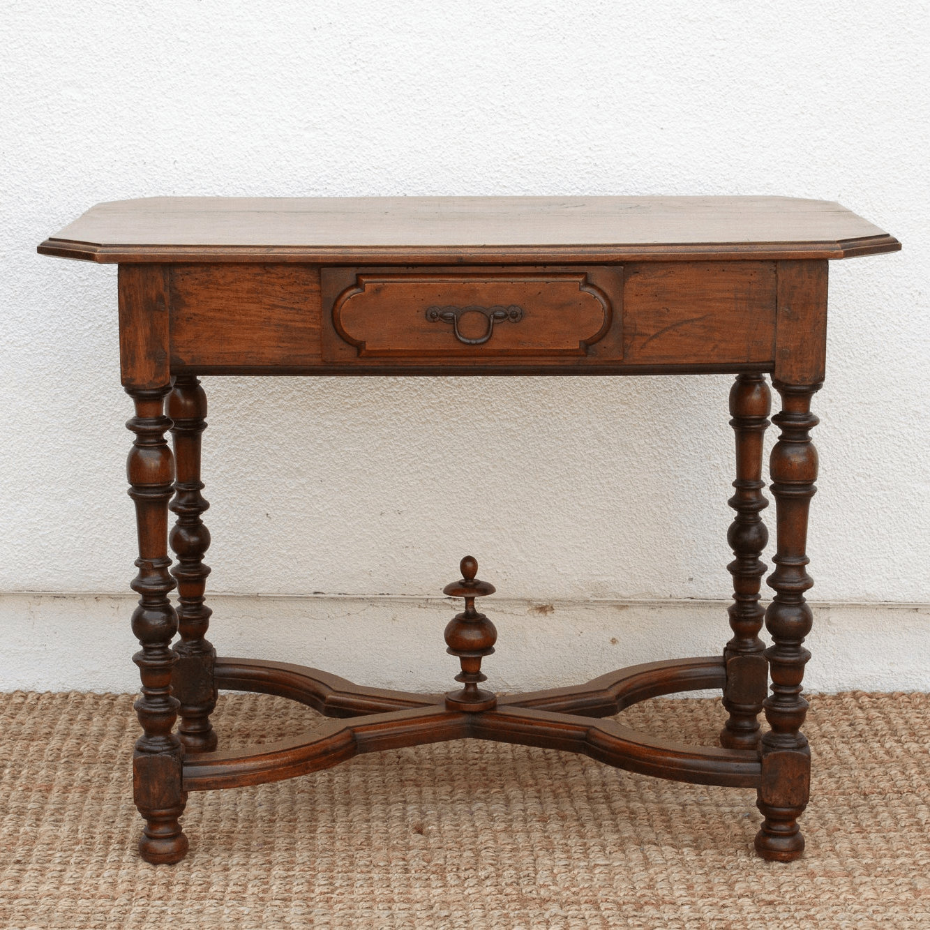 Its silhouette — elegant yet restrained — carries subtle echoes of the Louis XIV and Louis XV periods, where symmetry met sensuality in furniture design. The antique table rests on finely turned legs, each sculpted with rhythm and precision, connected by an exquisitely curved stretcher crowned by a delicate finial. This central ornament, both structural and decorative, is a hallmark of refined French joinery — the craftsman’s flourish hidden within a piece made for daily use.