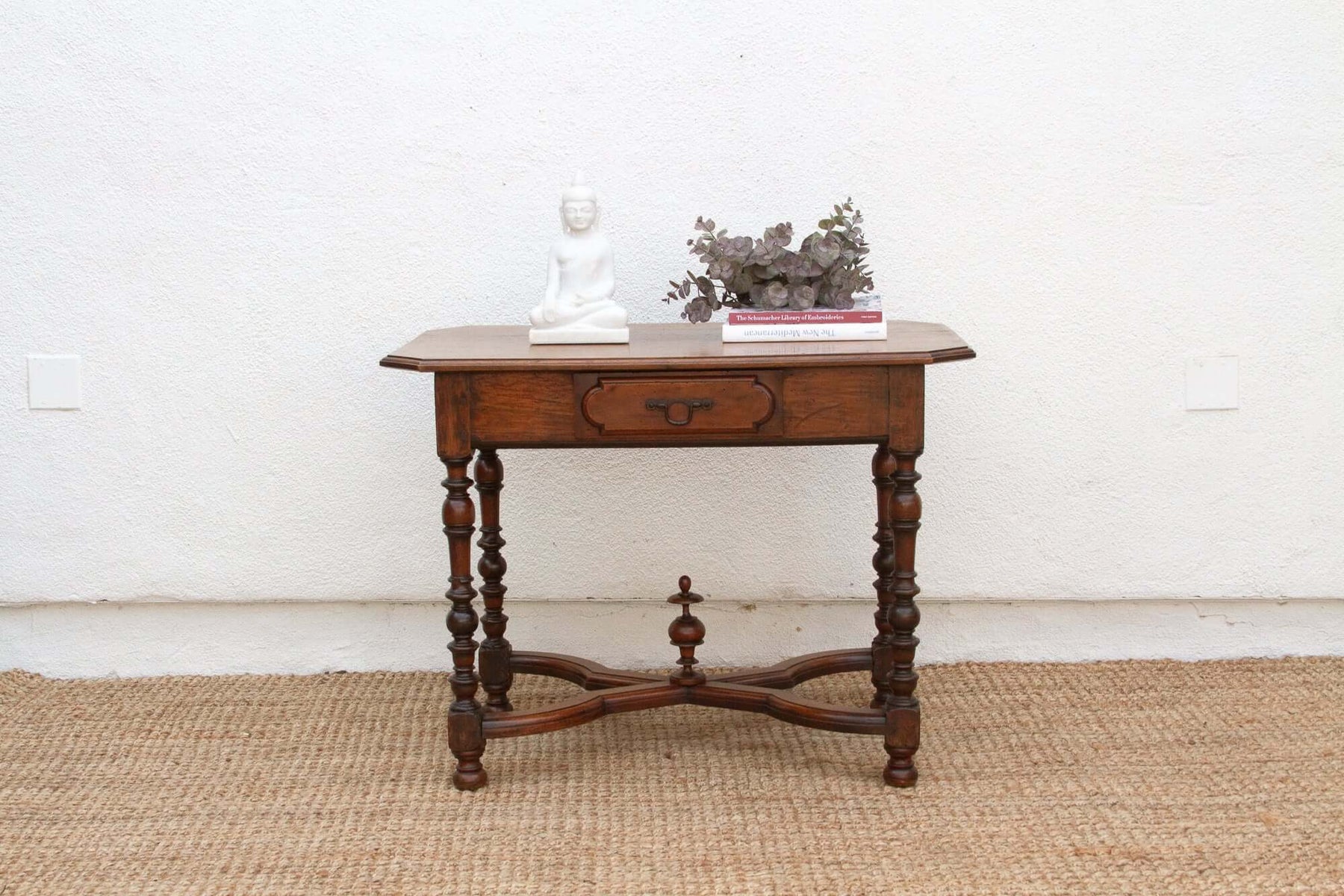 The single drawer is framed by carved moldings and fitted with iron pull hardware, balancing utility and aesthetic grace. It offers a discreet space for stationery, correspondence, or treasured keepsakes — a quiet reminder of a time when every letter began with intention. Each edge and joint bears the softened patina of age, that warm, tactile sheen which only a century of touch can create.