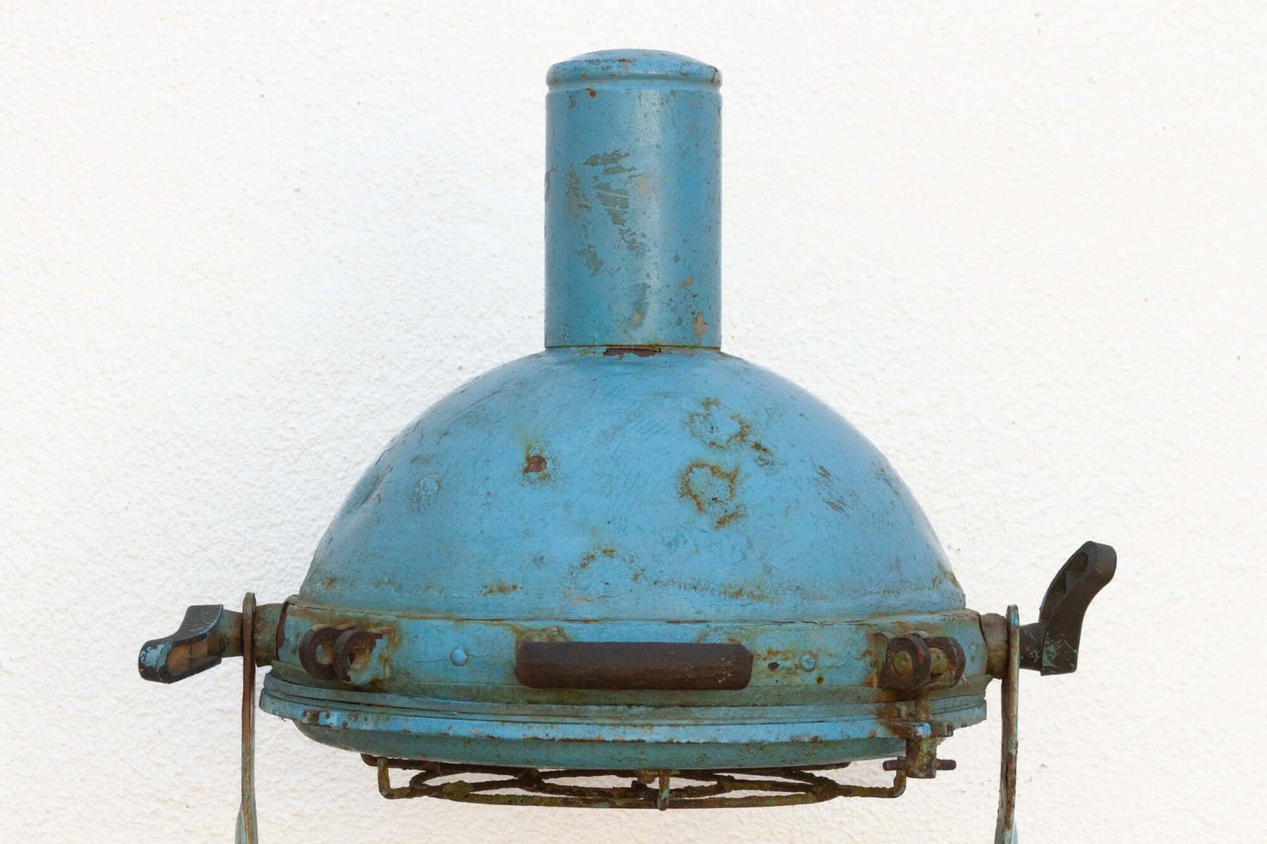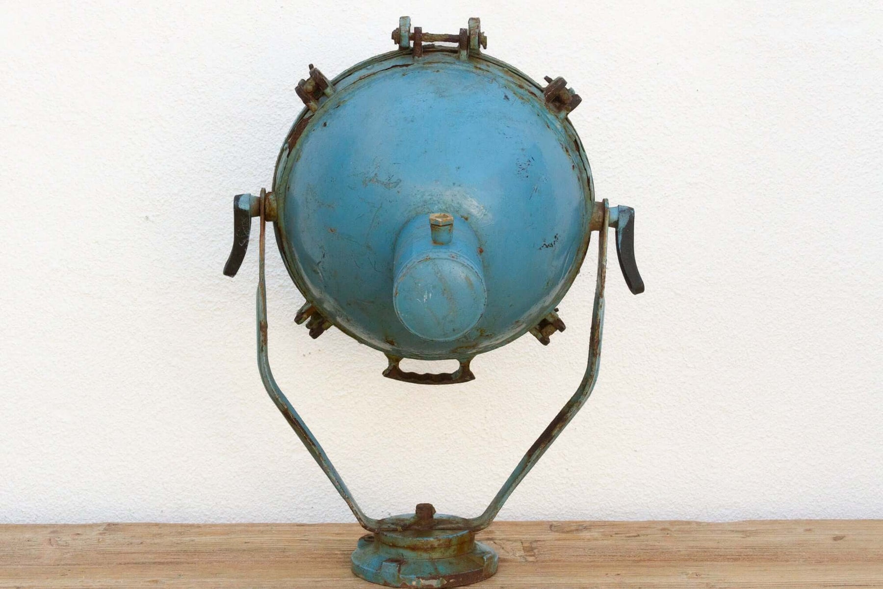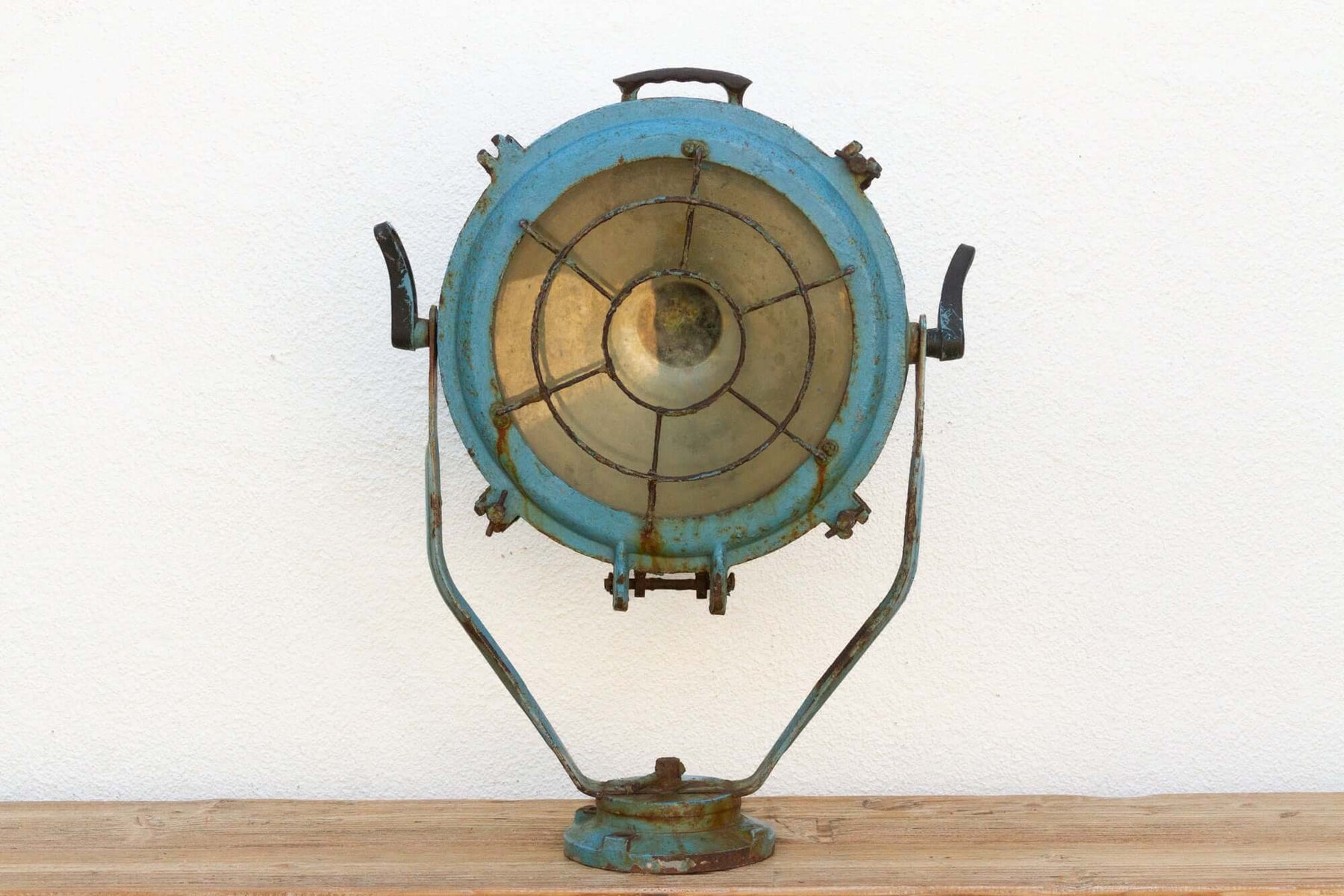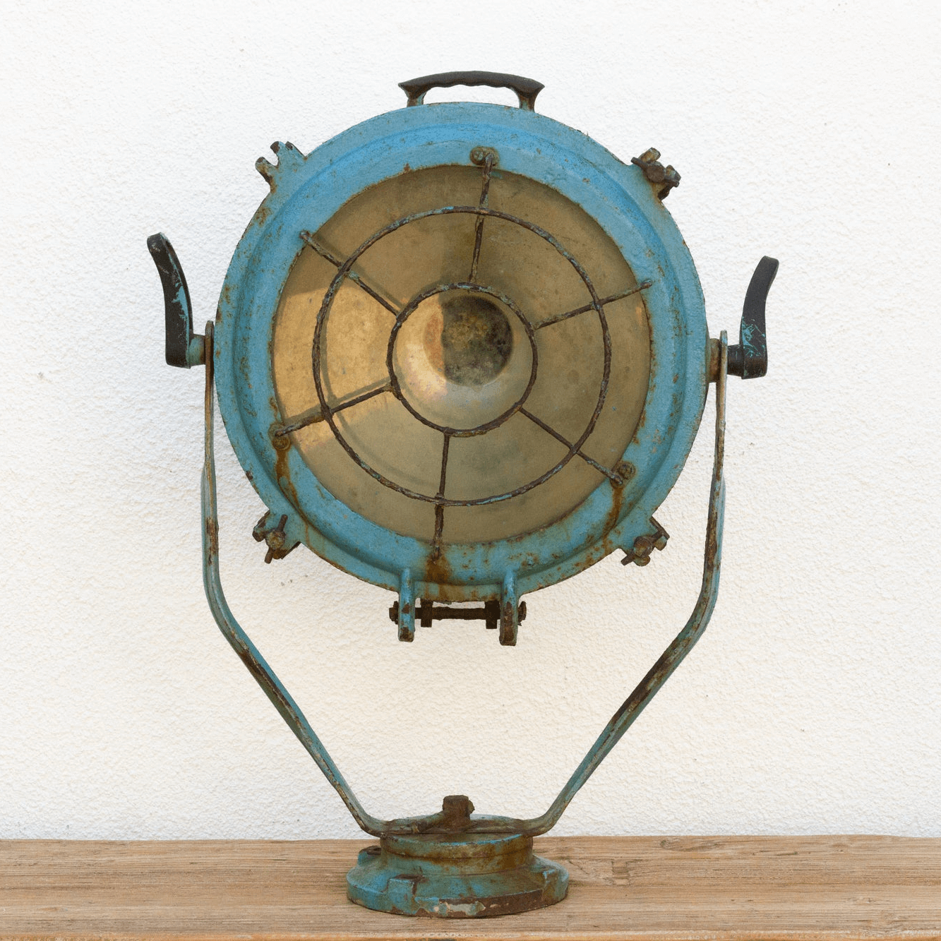 Fashioned from heavy-gauge metal and glass, the spotlight embodies the practical beauty of early industrial design. Its sea-blue painted finish, flaked and softened by time, has aged into an extraordinary patina — the color of ocean depths meeting oxidized steel. Traces of rust and oxidation appear like a maritime map across its surface, revealing a century of exposure to brine and sun. Behind the protective iron grille, the concave reflector glows faintly golden, its surface still capable of capturing and magnifying light with quiet authority.