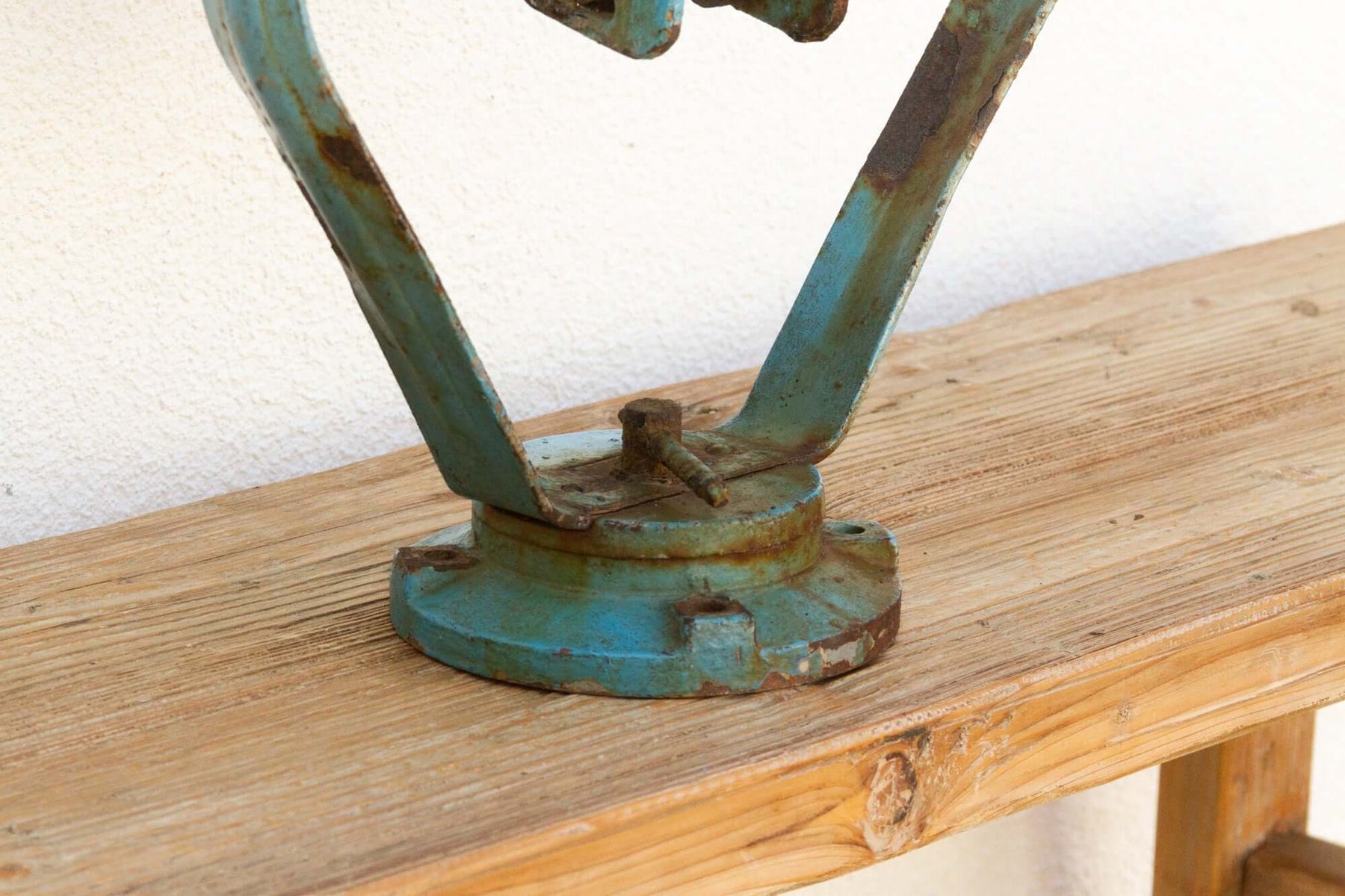 The Antique Nautical Ship Spotlight stands as a commanding emblem of the seafaring age — a fusion of utility and artistry forged from the salt, steel, and silence of the open sea. Once mounted aboard a working vessel, this striking blue metal spotlight illuminated the decks and harbors of an earlier century, guiding sailors through fog and darkness. Today, its presence carries that same luminous spirit — a sculptural relic, and authentic antique whose every weathered surface tells a story of endurance and craft.