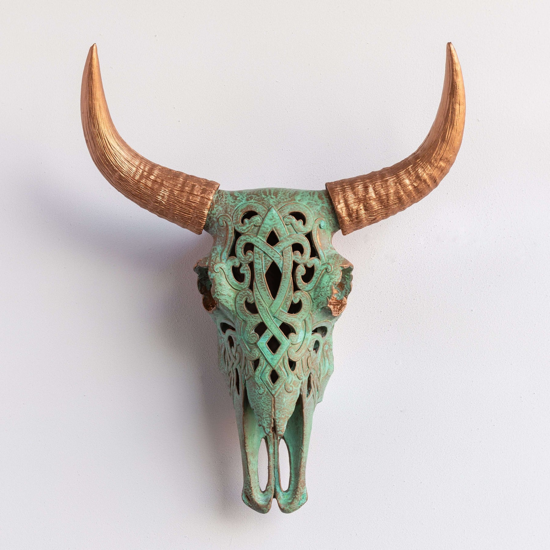 Each sculpture is artisan-made from cruelty-free resin, carefully cast to achieve extraordinary detail. The ornate carvings, inspired by ancient scrollwork and desert motifs, transform the raw geometry of the skull into a work of art. Swirling patterns dance across its surface, creating a lacework of shadow and light that feels both primitive and elegant. Though the piece evokes the spirit of the cattle trails and sunlit mesas, its refined matte finish gives it a sculptural modernity — making it equally at home in a Western lodge, a Bohemian studio, or a Modern Farmhouse interior.