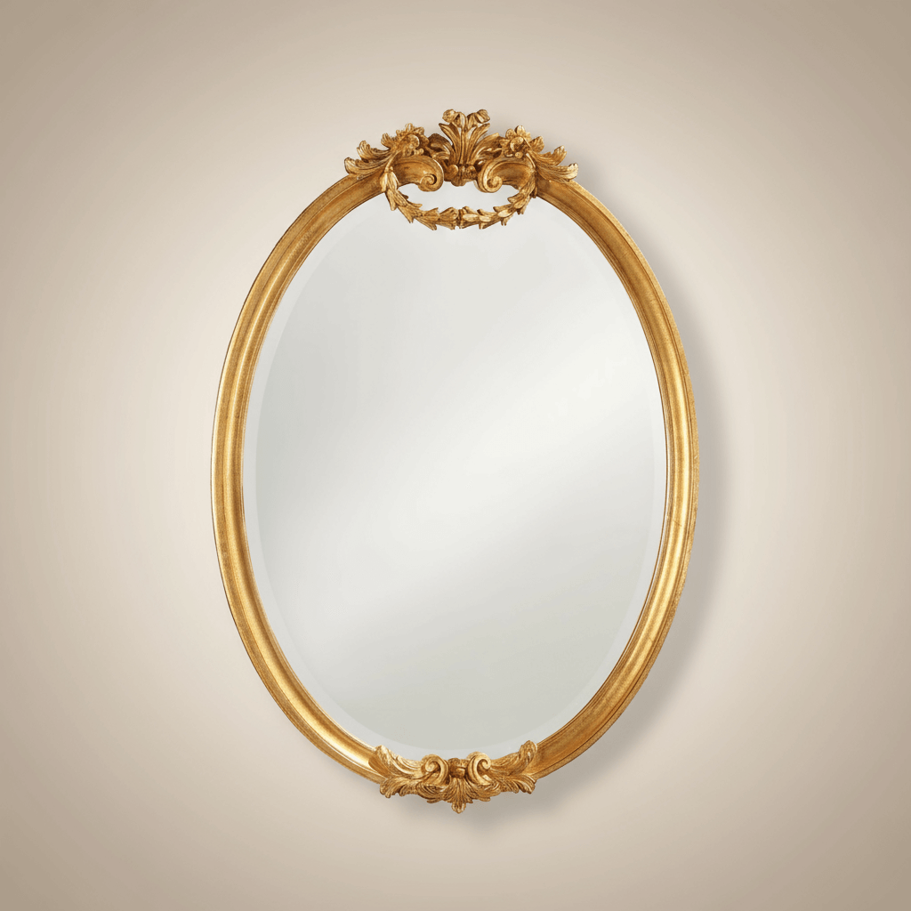 The mirror’s oval form and ornate crest recall the neoclassical sensibilities of 19th-century Italy — a period when mirrors were more than functional objects; they were portals of beauty, crafted to amplify light and reflect the grace of their surroundings. This design, with its acanthus-leaf detailing and subtle garland motif, pays homage to that legacy. It evokes the feeling of walking through a villa bathed in late-afternoon sun, where golden tones shimmer across plaster walls and the scent of lemon oil and linen lingers in the air.