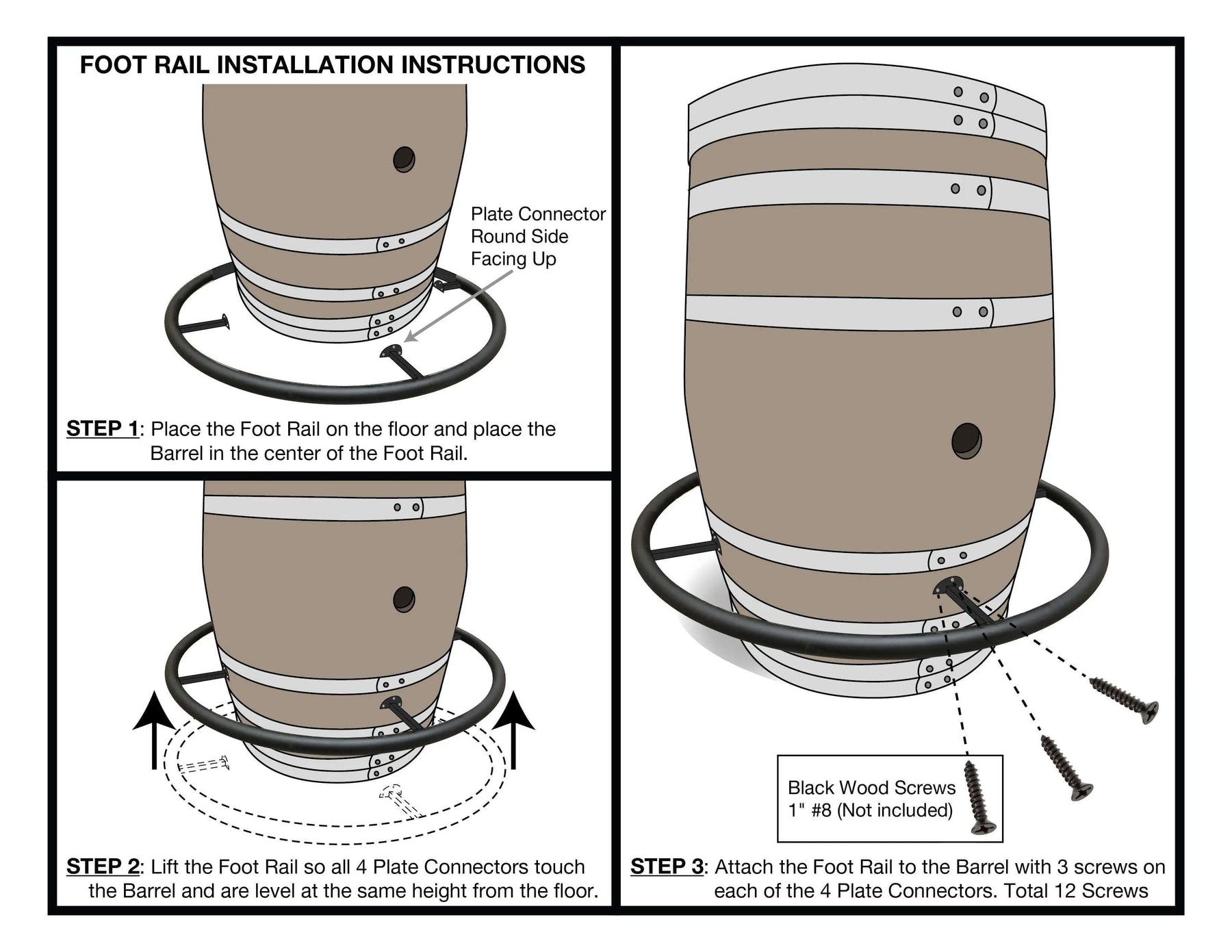 Surrounding the barrel base is a steel footrail, sturdy and durable, designed for both comfort and architectural harmony. It installs easily with standard #8 screws (not included), ensuring seamless integration and long-lasting stability.