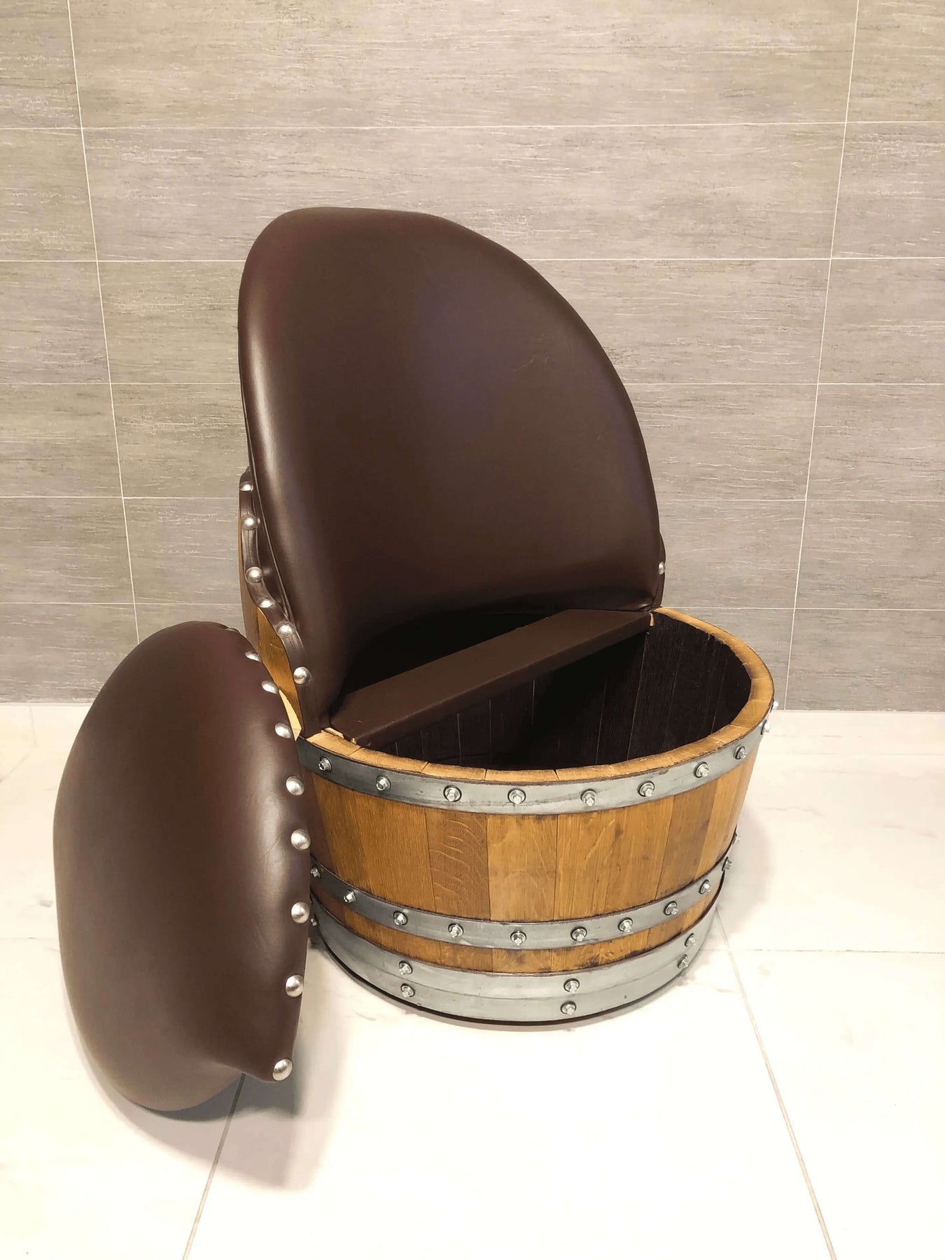 This handcrafted set — featuring two full wine barrel chairs and a matching half-barrel coffee table — evokes the welcoming warmth of Vintage Farmhouse living. The chairs, formed from the rounded bellies of solid oak barrels, are topped with supple, memory foam–cushioned seats upholstered in rich brown vinyl. The tactile contrast of soft vinyl against cool metal studs recalls the honest charm of vintage tack rooms and countryside manors. Beneath each seat, hidden wheels offer effortless movement, while removable tops reveal discreet storage — a clever fusion of form and function, wrapped in rustic refinement.