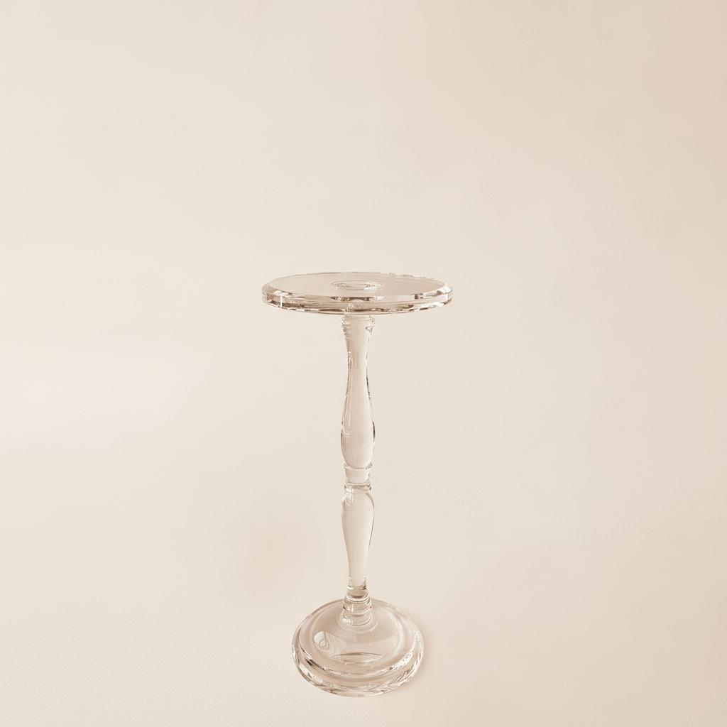 Its form is striking in its simplicity: a slender pedestal supporting a round tabletop, clear as captured water. The craftsmanship is unmistakably refined — each edge softened, every surface hand-polished to achieve that rare balance between clarity and warmth. As sunlight or candlelight passes through, it scatters across walls and ceilings in delicate prisms, lending the room a quiet opulence reminiscent of Old Hollywood drawing rooms and grand European salons.