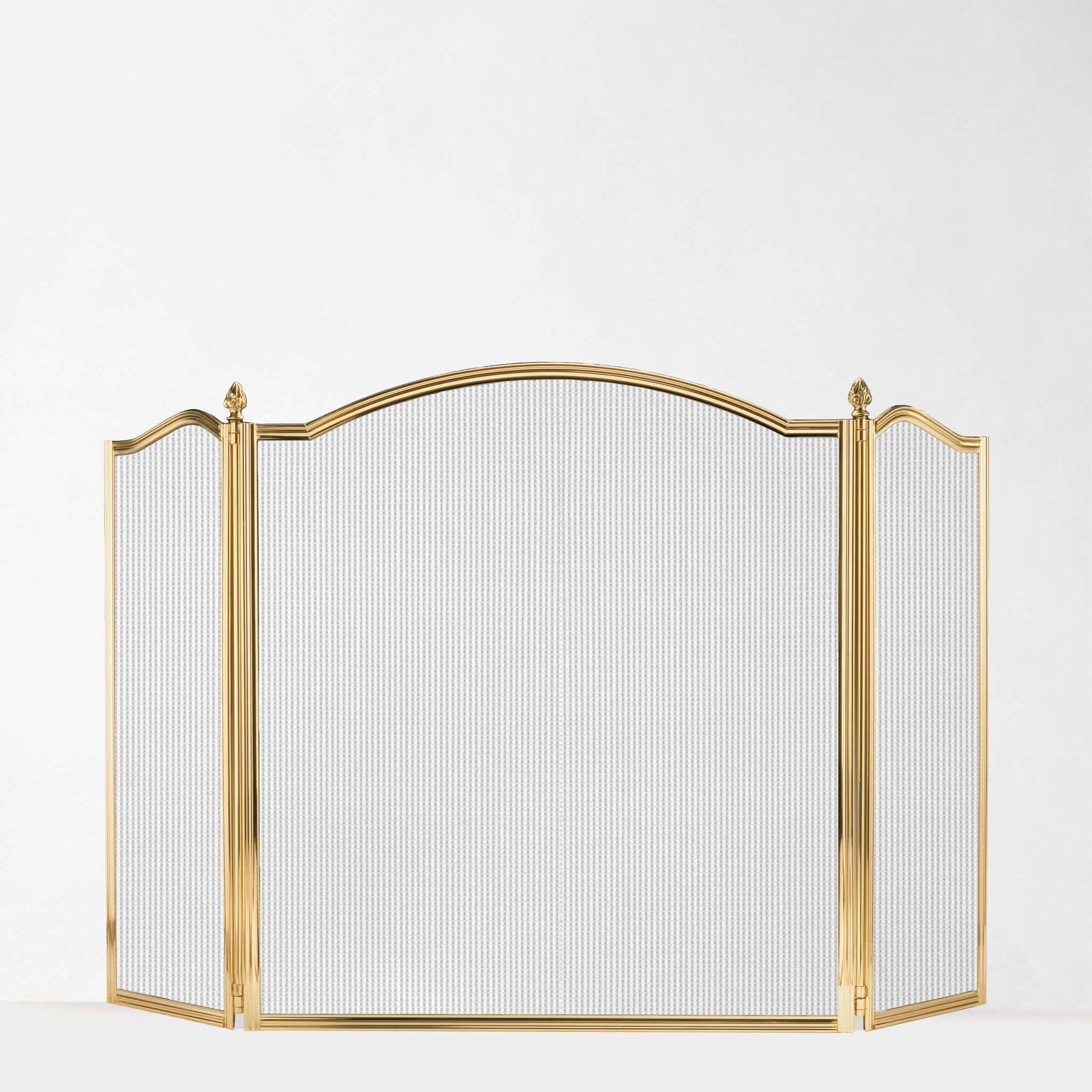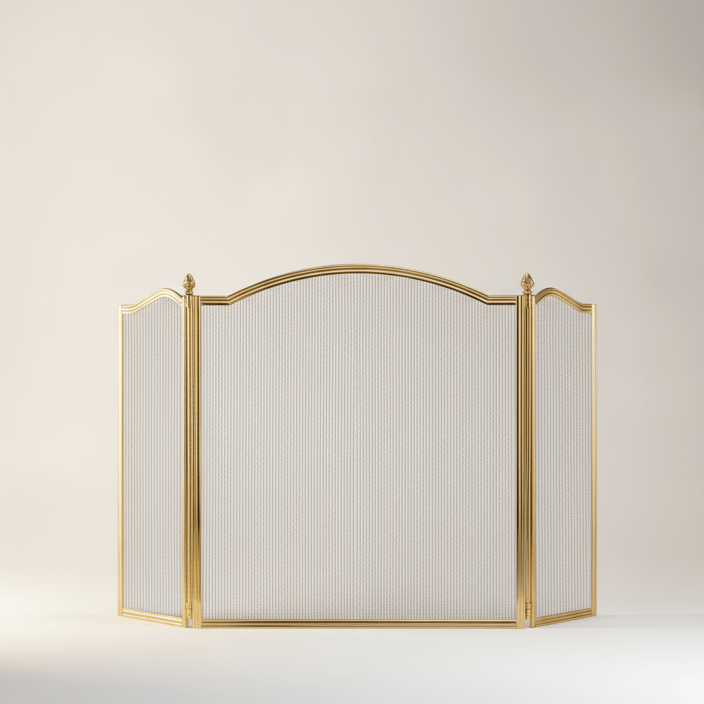 Its polished brass frame gleams with quiet luxury, each curve and contour softened by hand-finishing and sealed beneath a subtle lacquer to preserve its golden luster. The arched silhouette recalls 19th-century European fire screens, where form was as vital as function, and evenings were lit by the gentle shimmer of firelight dancing upon metal. Behind the frame, a fine black mesh offers both contrast and clarity — allowing the glow of embers to flicker through like candlelight through lace.