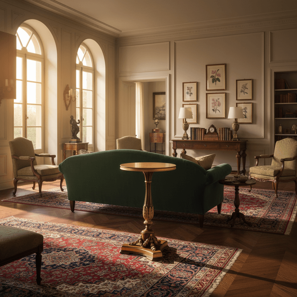 This piece is steeped in Vintage Glamour, that distinctive blend of European opulence and timeless understatement. The Neoclassical influence is unmistakable — the pedestal rising like a Corinthian column, anchored by a base adorned with cascading acanthus leaves, their gilded edges gently burnished to reveal warm undertones of wood beneath. The result is a living interplay between luster and patina, old-world grandeur and artisan intimacy.