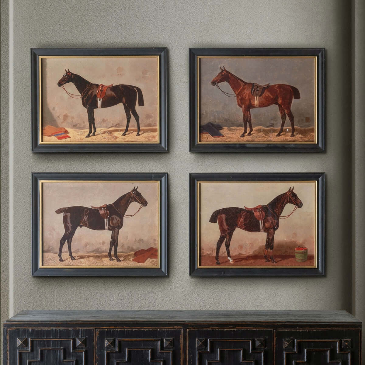 Within interiors influenced by Old World Manor Decor, these works feel entirely at ease. They pair beautifully with paneled walls, leather club chairs, antique desks, and shelves lined with history and literature. In a study, library, or formal living room, they evoke the atmosphere of private clubs, ancestral homes, and heritage estates where equestrian pursuits shaped daily life. Yet they are equally compelling in transitional spaces—hallways, staircases, or entryways—where they quietly announce a reverence for tradition.