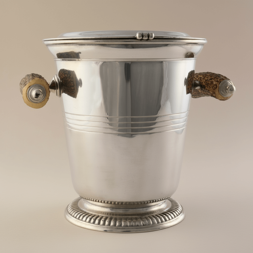 The Lodge-Style Pewter Ice Bucket with Antler Handles exudes the spirit of a fireside gathering — imagine it resting on a stone hearth or a polished sideboard, filled with glistening cubes and cradling a fine bottle of champagne or whiskey. It speaks of quiet evenings after the hunt, of laughter rising through the crackle of logs, and of traditions cherished across generations. The sound of tongs clinking against its pewter rim feels timeless, the weight of its lid reassuring in the hand.