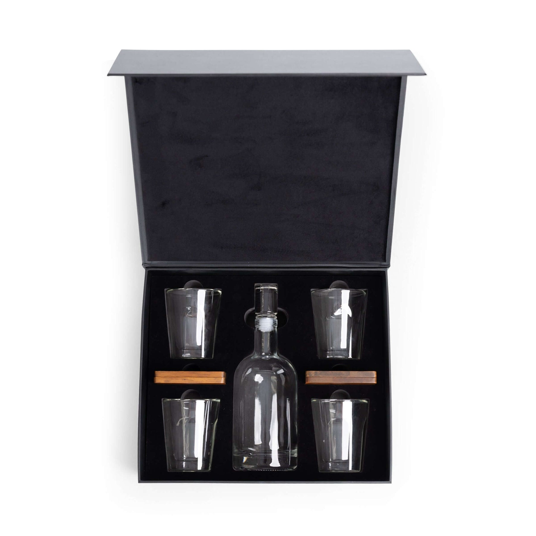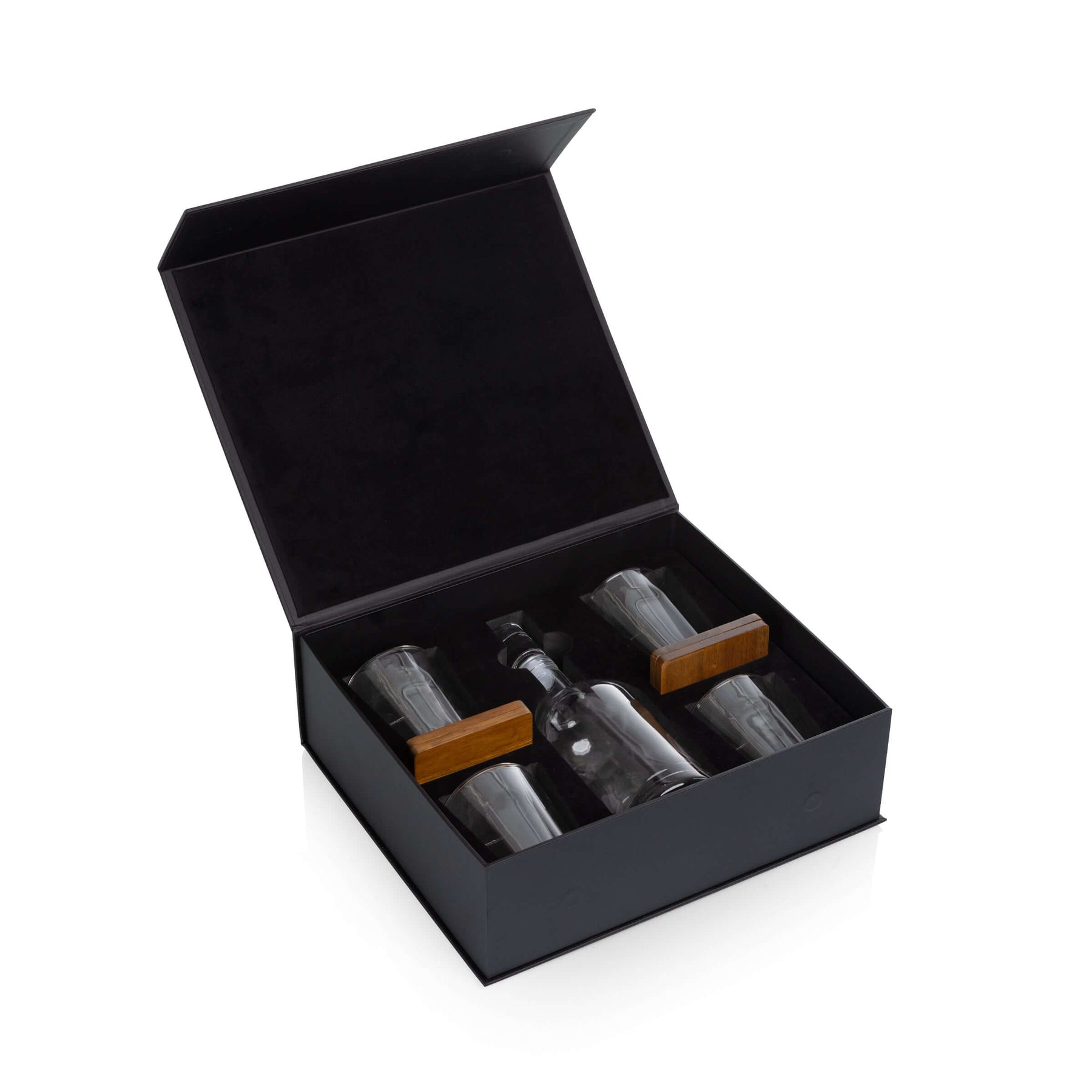 Encased in a stately black faux leather box, this set exudes quiet authority — sleek, structured, and made for those who appreciate the luxury of restraint. Open its magnetic lid, and a world of refinement awaits: a handcrafted glass decanter, four perfectly weighted lowball glasses, and four warm parawood coasters, each element nestled in a bed of soft black velvet. It’s a tableau that feels less like a drinkware set and more like a gentleman’s heirloom rediscovered.