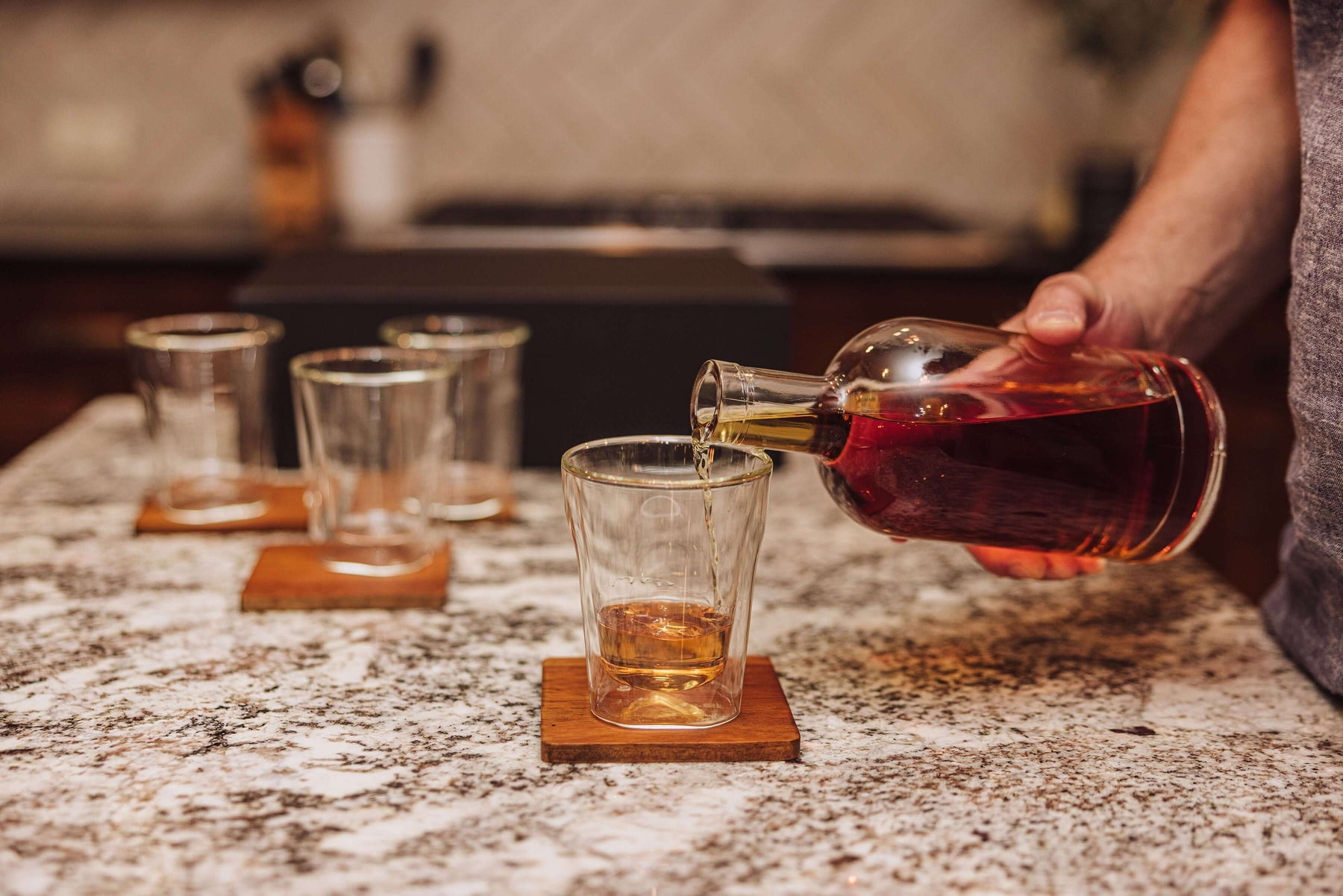 Complementing it are four tumbler glasses, each 3.9 inches tall and 3.1 inches wide, holding a generous 250ml — ideal for savoring neat pours or classic cocktails. Their minimalist design invites appreciation of the spirit’s color and clarity, while their weight in hand conveys balance and intention. Beneath each glass rests a 3.5-inch parawood coaster, their natural grain and amber tone adding organic warmth to the set’s otherwise urbane palette. Together, glass and wood echo the tactile contrasts of tradition: smooth crystal meeting the gentle imperfection of nature.