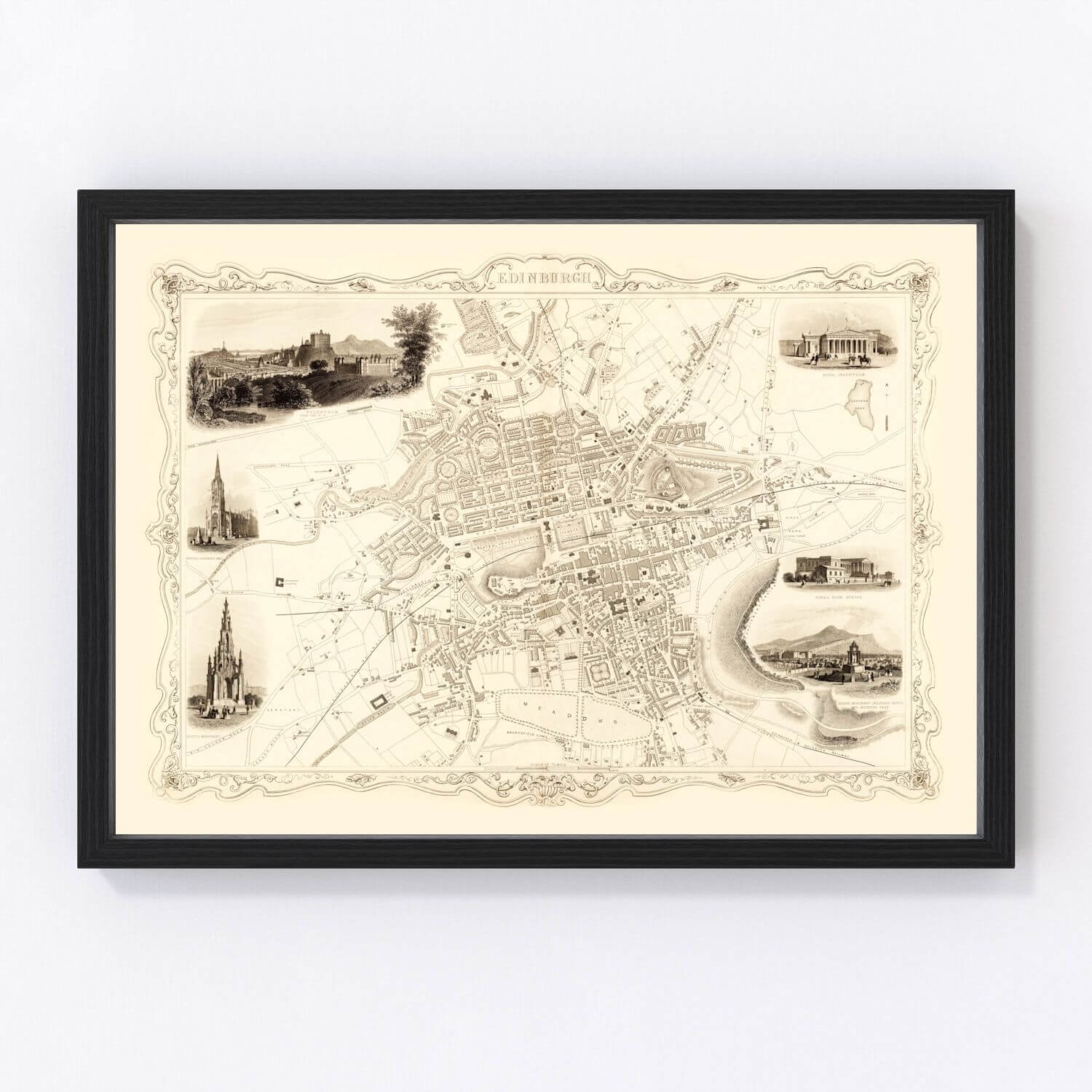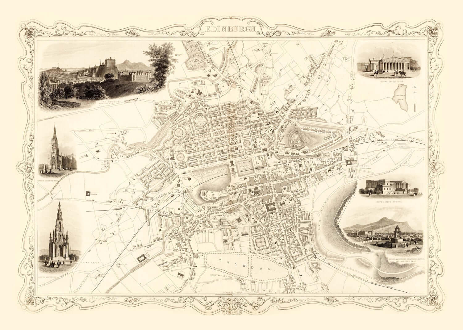 • Faithful reproduction of an 1851 map of Edinburgh with architectural vignettes