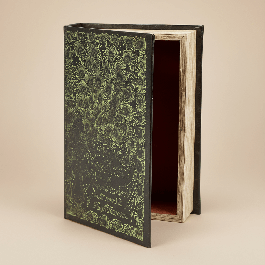 Open the cover, and you’ll find a hidden velvet-lined compartment — an intimate little world designed to cradle keepsakes, jewelry, or private letters. The faint resistance of the magnetic clasp offers a quiet sense of security, a satisfying click that recalls the closing of a cherished book after the final chapter. On a shelf, it stands convincingly as a vintage tome, complete with a faux leather spine embossed with Pride and Prejudice by Jane Austen and the illustrator’s name, Hugh Thomson.