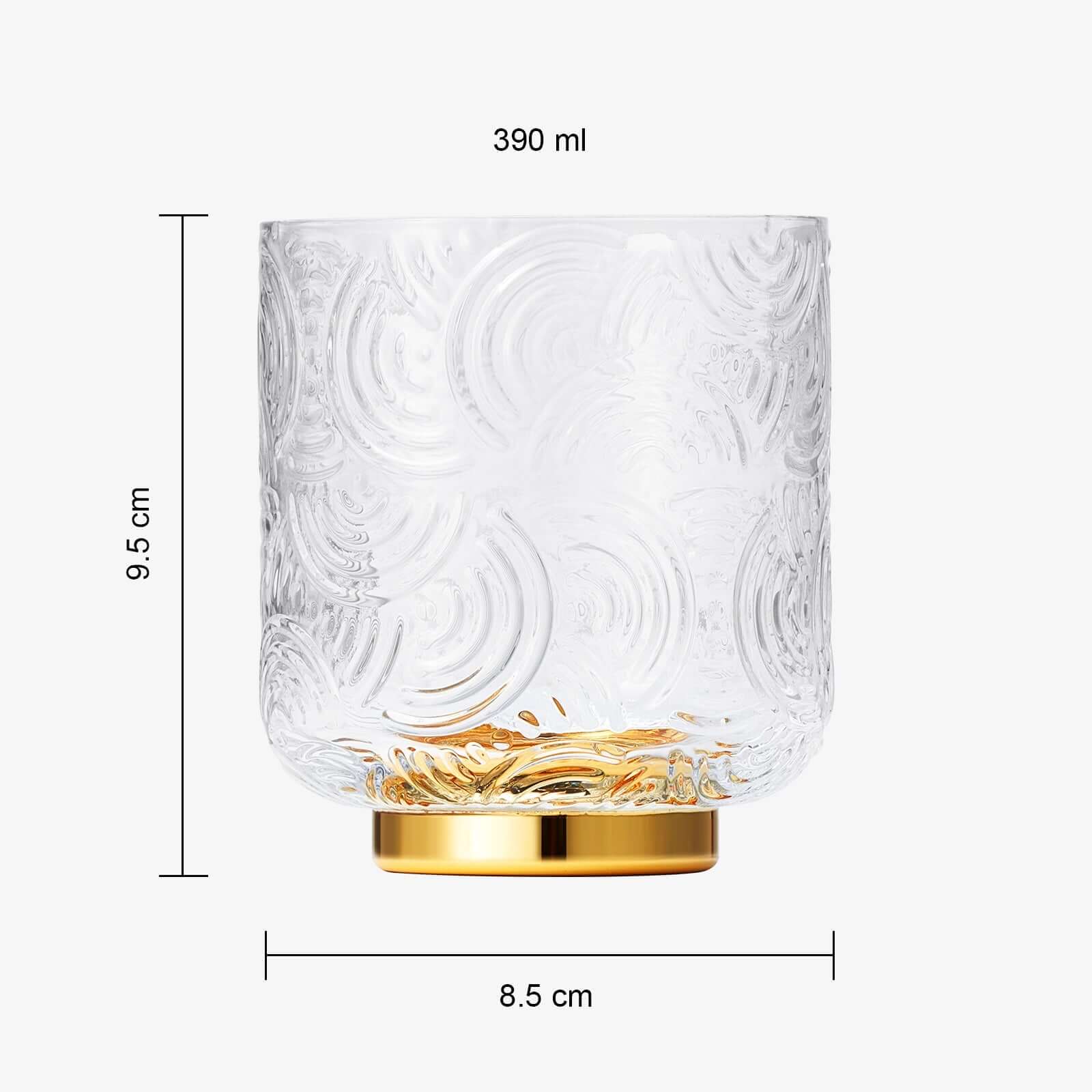 Pressed into crystalline clarity, the arc-patterned surface catches and scatters light in small, enchanting refractions. When filled with your preferred libation — perhaps a lime-bright gin rickey, a well-balanced Old Fashioned, or simply iced water with citrus — the pattern comes alive, interacting with color and sparkle like the facade of a Deco theater at dusk. A gleaming gold-toned base anchors the silhouette and adds that irresistible hint of luxury, a detail that echoes the era’s fondness for metallic accents and golden embellishment. In both hand and eye, the Art Deco Lowball Cocktail Glasses feel like a rediscovered relic of 1920s Vintage Glamour.