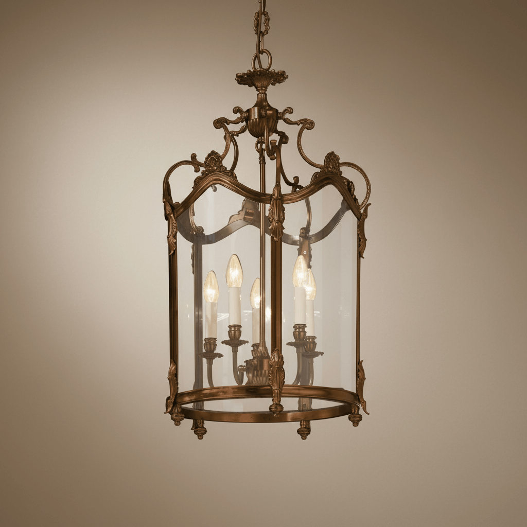 Imagine it suspended in an entryway where light greets guests like an embrace, or above a dining table where laughter gathers beneath its radiant canopy. Its presence transforms the ordinary into the ceremonial. In the evening, the amber light glances off its polished bronze frame, casting warm reflections that dance across plaster walls, marble floors, or gently aged oak beams. Every detail — from the curling acanthus motifs to the balanced geometry of its glass cage — speaks of meticulous design and unwavering attention to proportion. It is at once substantial and delicate, its graceful silhouette making it equally suited to a grand foyer or an intimate library.