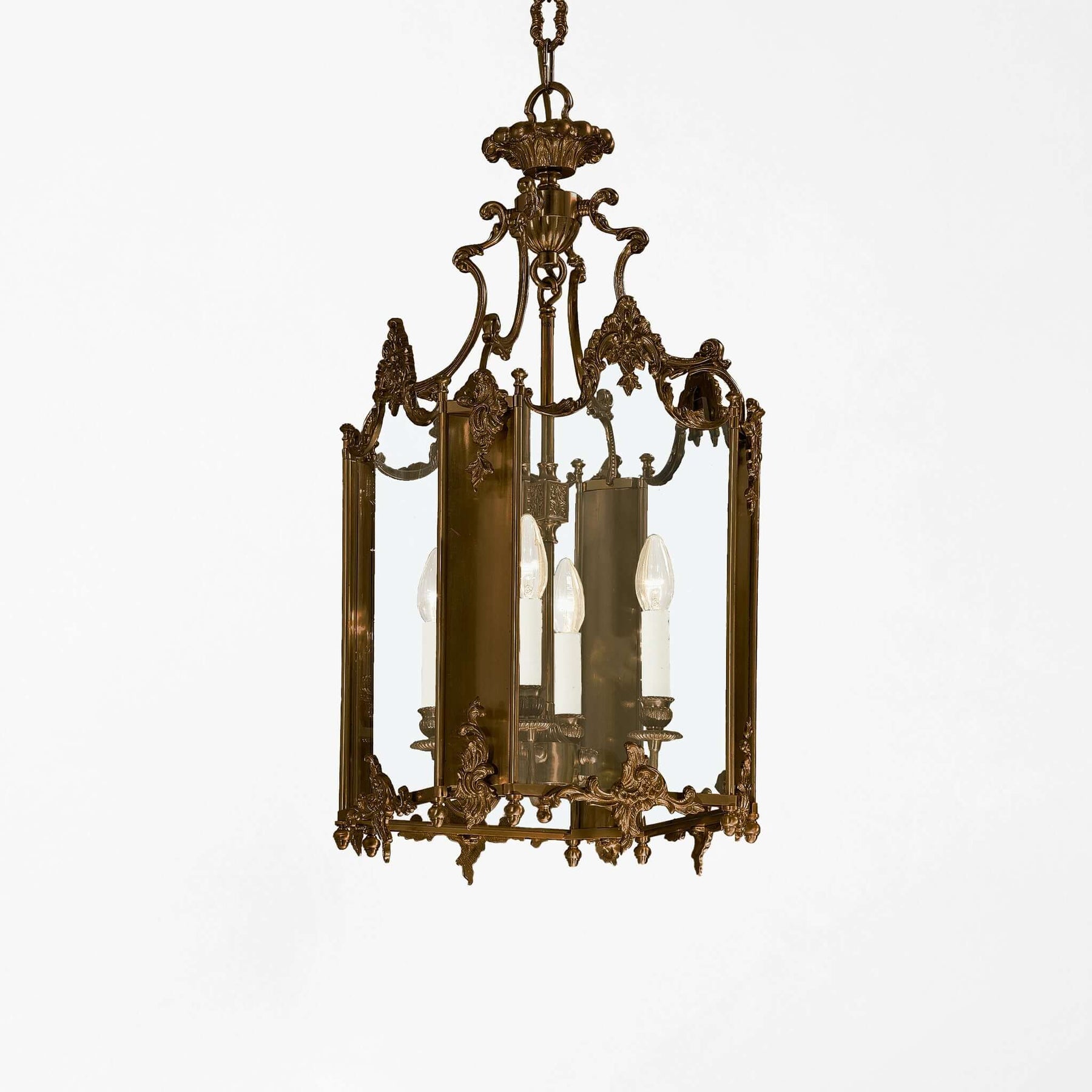 Suspended from an ornate bronze chain, the lantern’s silhouette evokes the grandeur of 18th-century European estates, where craftsmanship was as much an art as it was a calling. Each element — from its scalloped crown to the sweeping scrolls that frame its beveled glass panels — is hand-finished in burnished bronze, giving the piece a patina that deepens with time. Its reflection shimmers in the surrounding glass, echoing the flicker of candlelight from centuries past.