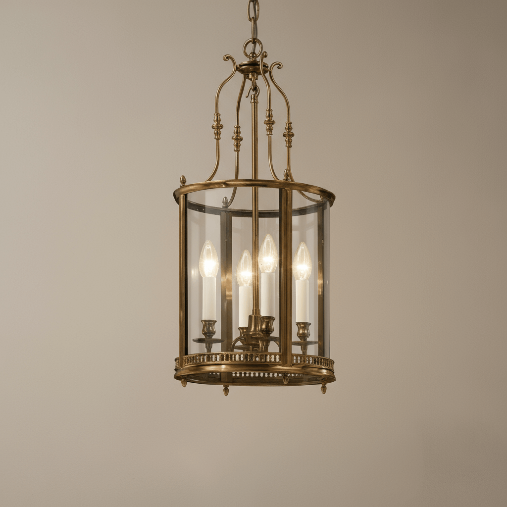 The Antique Bronze Lantern Chandelier with Glass Panels lends itself to countless interior narratives. In a high-ceilinged entryway, it becomes an inviting beacon of welcome. Over a dining table, it bathes gatherings in a golden intimacy, where conversation and laughter linger beneath its soft light. Hung in pairs down a long corridor, it creates rhythm and harmony, its repeated glow echoing the elegance of a bygone era. Its architectural clarity allows it to blend effortlessly with other design periods — from French Provincial to Industrial Luxe — always adding a layer of refinement.