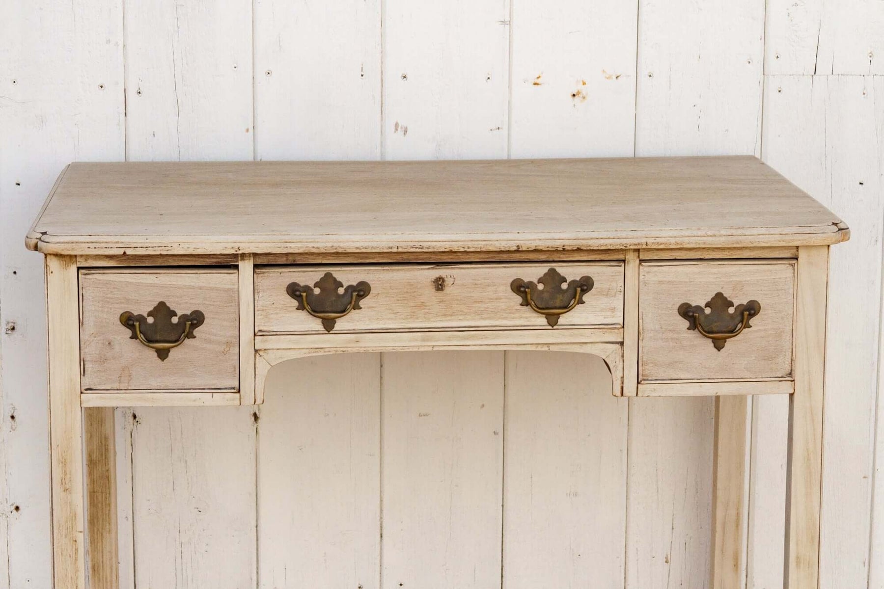 At first glance, its silhouette tells the story of balance: the generous rectangular top, the subtle shaping of the apron, and the delicate taper of the legs all working in graceful concert. The three drawers that line its front — each adorned with its original brass hardware — speak of centuries past, their time-softened sheen a testament to honest age. These pulls, with their distinctive escutcheon forms, have darkened beautifully over time, their warmth deepening against the pale, bleached finish of the mahogany.