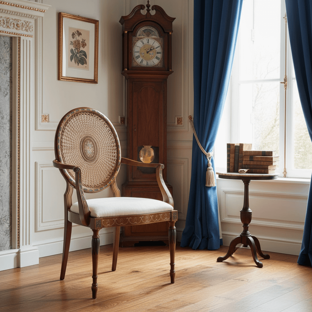 The chair’s round cane back — woven in a precise sunburst pattern — feels like a medallion of light. Its openwork radiates warmth, allowing sunlight to filter through the lattice in soft, dappled tones. The frame, carved by hand, reveals classical motifs and fluted legs that nod to neoclassical architecture. Subtle strokes of sage and gold paint accent the detailing, adding depth and movement to the honeyed wood beneath — a restrained luxury that defines Vintage Glamour interiors.