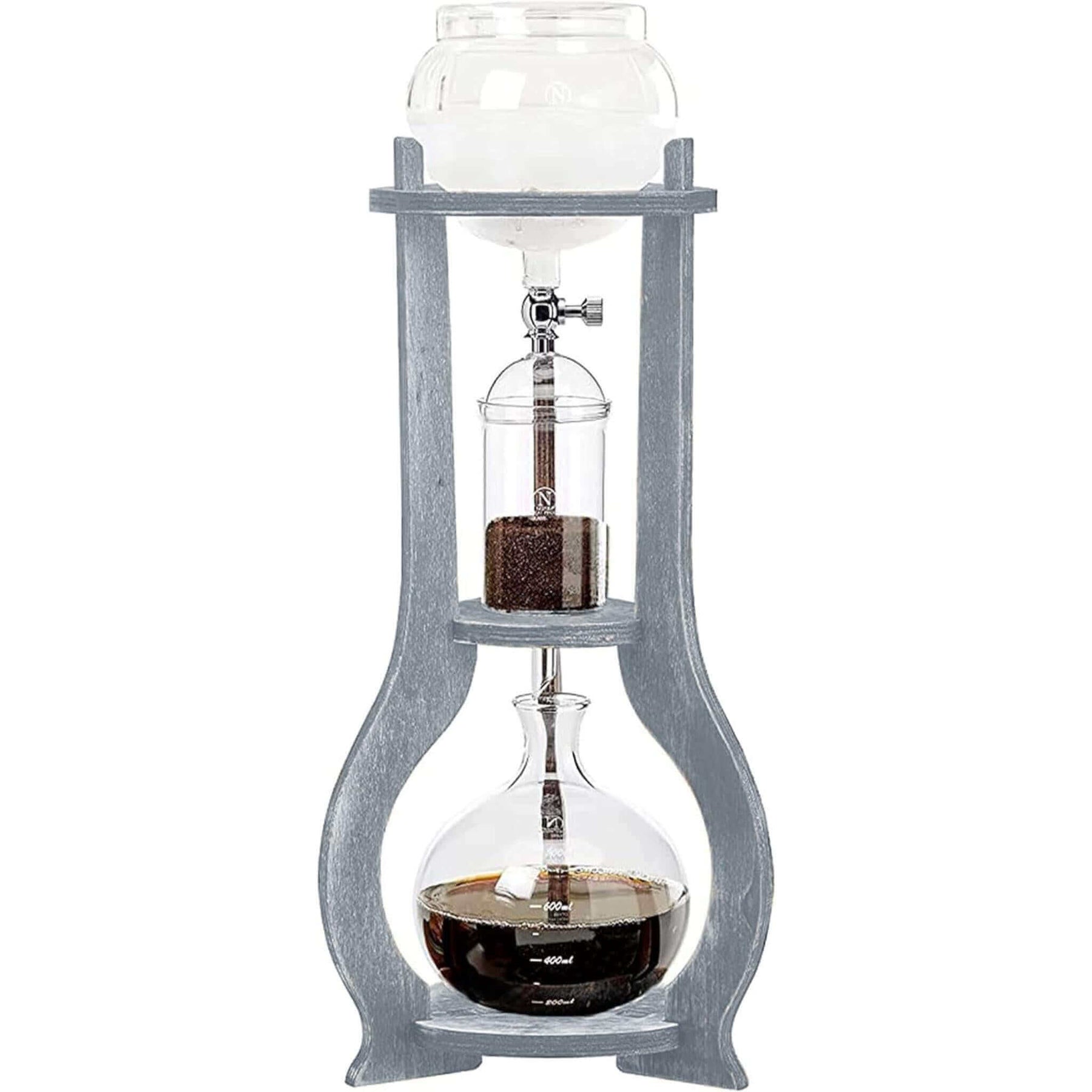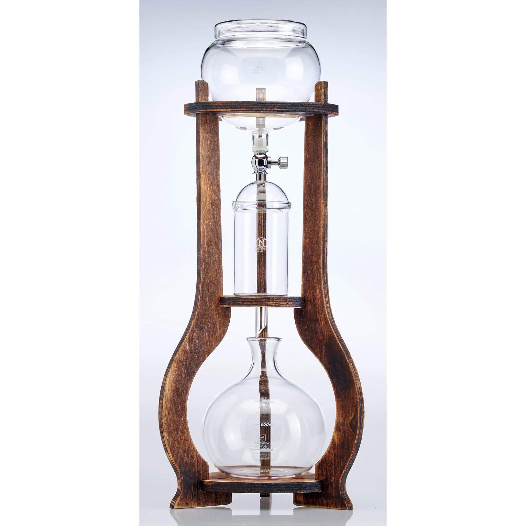 Vintage Wooden Cold Brew Coffee Maker Tower with glass vessels and wooden frame on display against white background.