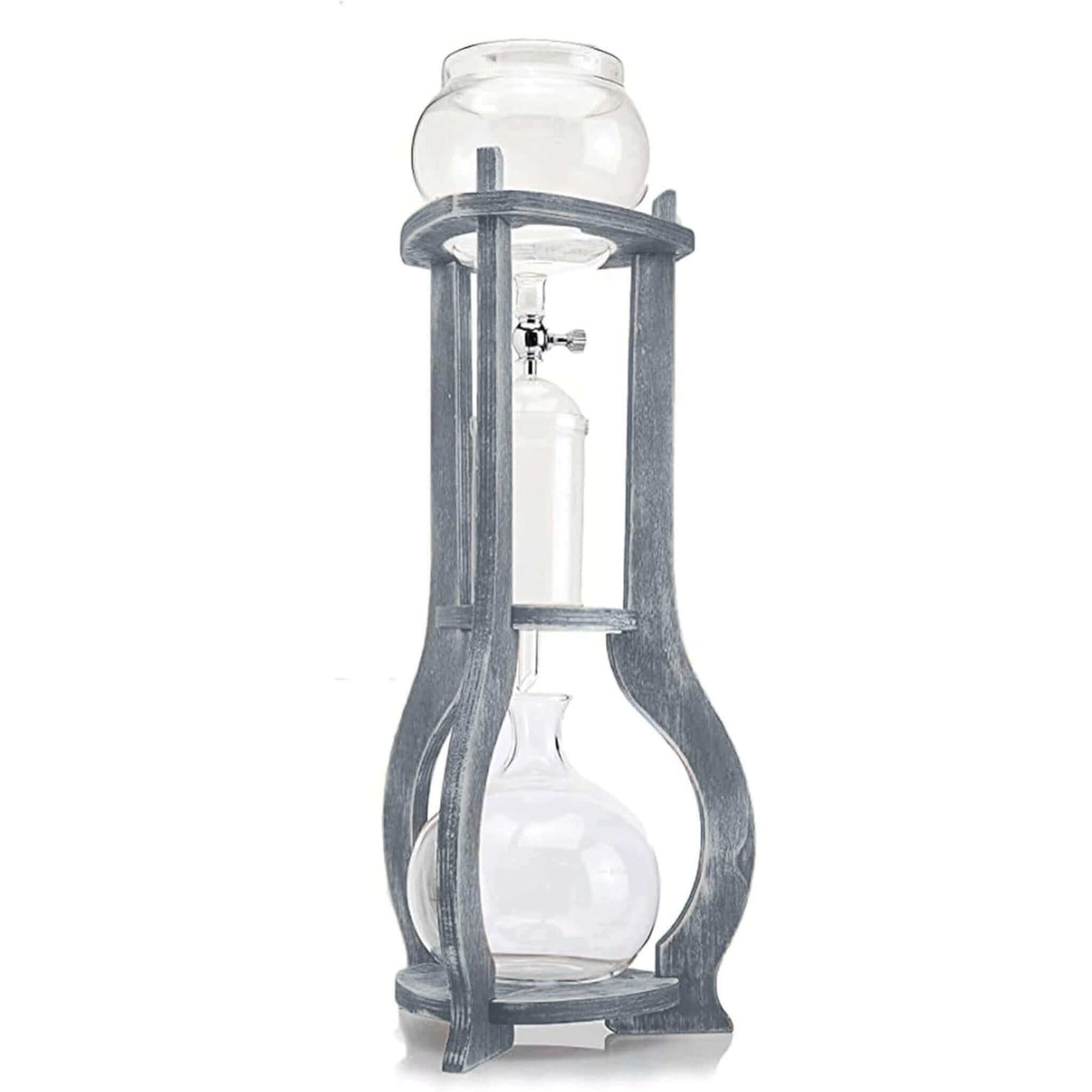 Vintage Wooden Cold Brew Coffee Maker Tower with hand-blown glass vessels and wooden frame, perfect for a retro-inspired kitchen.