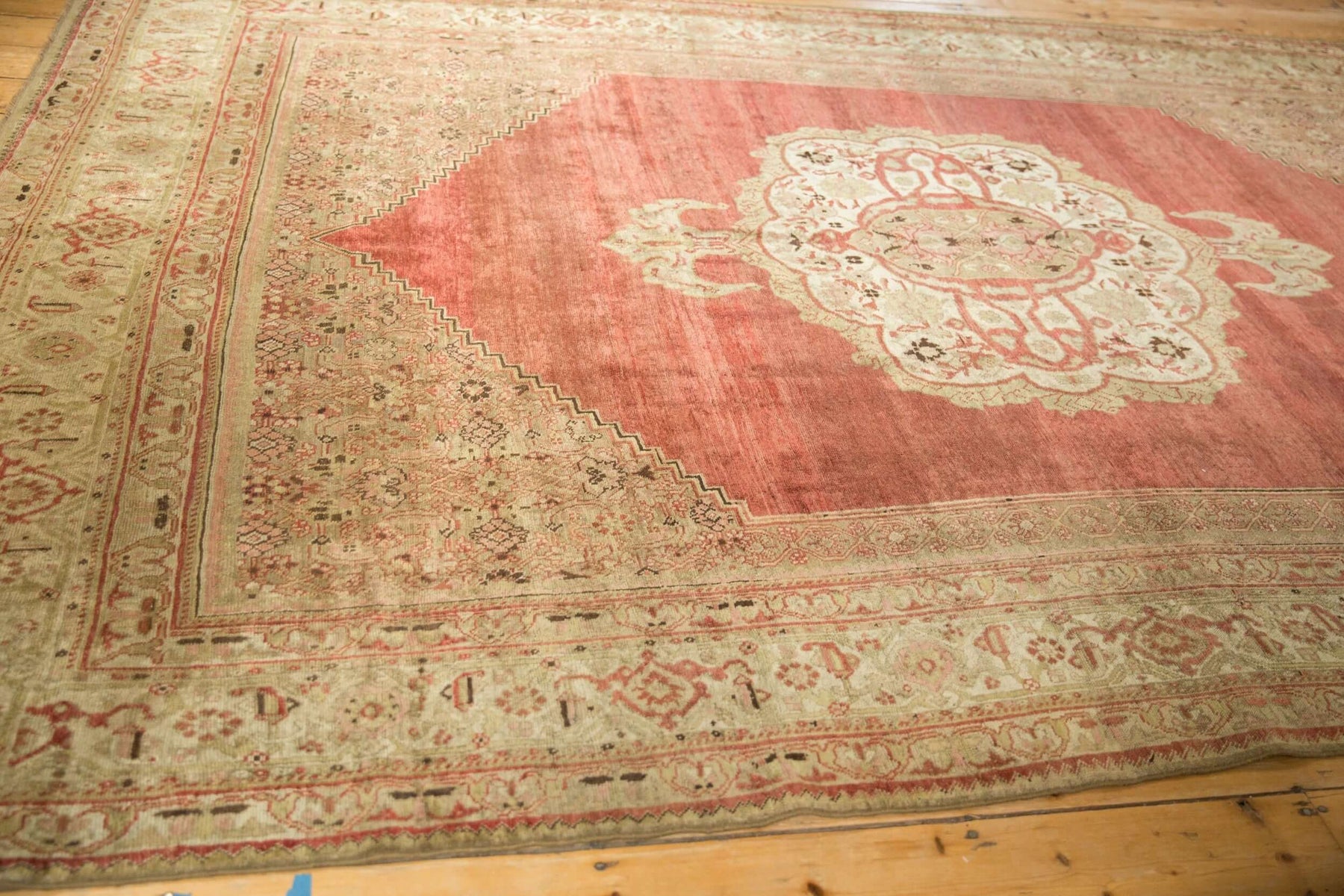 Woven in the storied region of Bijar, known as the “Iron Rug of Persia” for its tightly knotted durability, this carpet features a majestic central medallion — an ornate roundel framed by palmettes, arabesques, and scrolling tendrils. The field unfolds like a watercolor, softly abrashed with shades that shift between rose blush and muted gold, framed by intricate borders in turtle-samovar and boteh motifs. Each pattern seems to breathe history, its delicate geometry mellowed by the gentle patina of age.