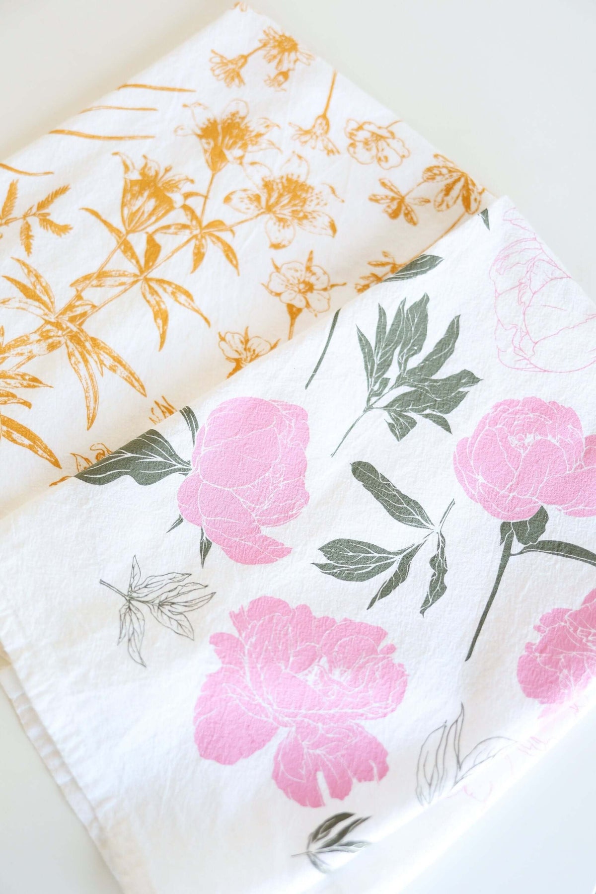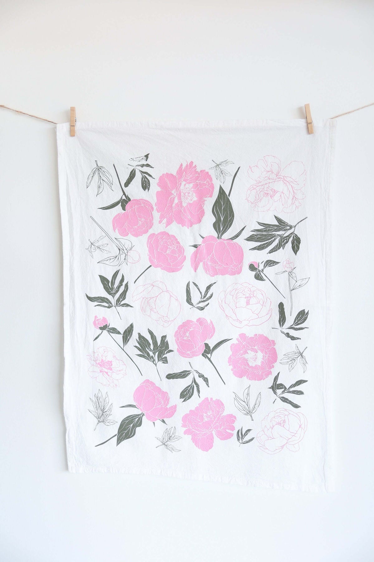 Each Vintage Peony Tea Towel is a small work of art, screen printed by local artisans in Leoma, Tennessee, using water-based inks that create a subtle watercolor effect. The result is a towel that feels as timeless as it looks — a piece that could easily have adorned a grandmother’s cozy farmhouse kitchen or a sunlit cottage by the sea. The romantic peony design blooms gracefully across the soft white fabric, bringing an air of freshness and nostalgia to every use.