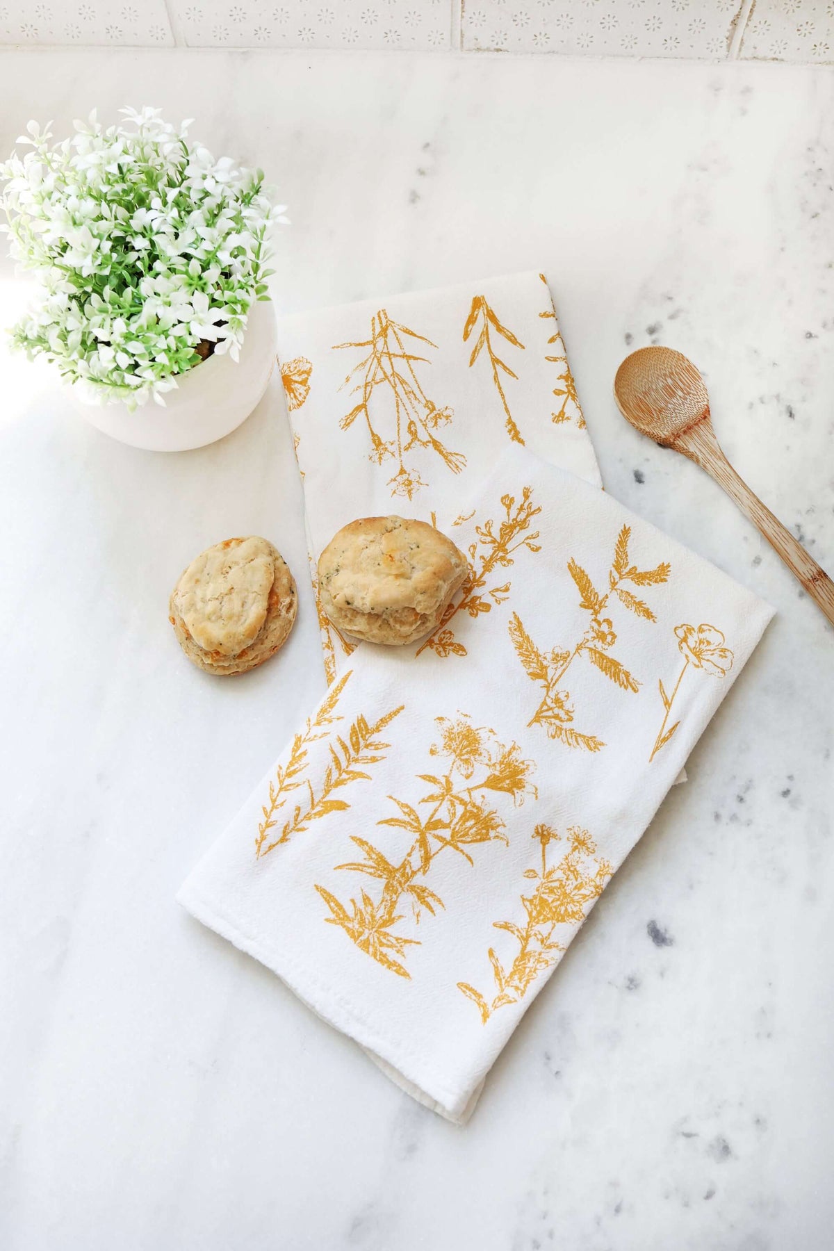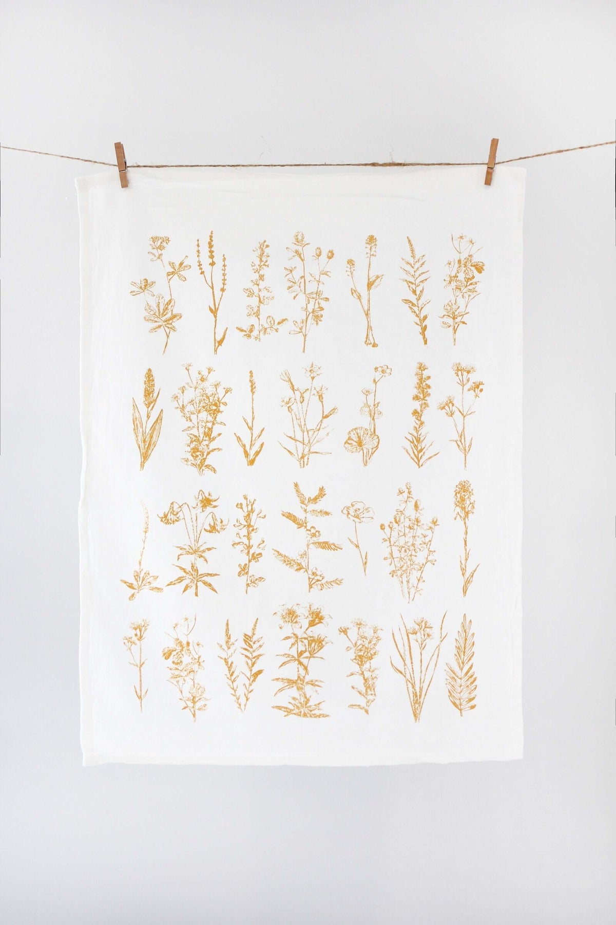 he Vintage Wildflower Botanical Tea Towel captures the fleeting beauty of wild meadows in midsummer — a soft whisper of sunlight, honeyed air, and the hum of bees drifting between blooms. Printed in a golden yellow reminiscent of pressed flowers on the pages of a timeworn journal, this cottage-inspired linen brings warmth and charm to your kitchen with every fold and flutter. Its delicate wildflower illustrations recall simpler days — when mornings began with the sound of a kettle and the scent of freshly baked bread.