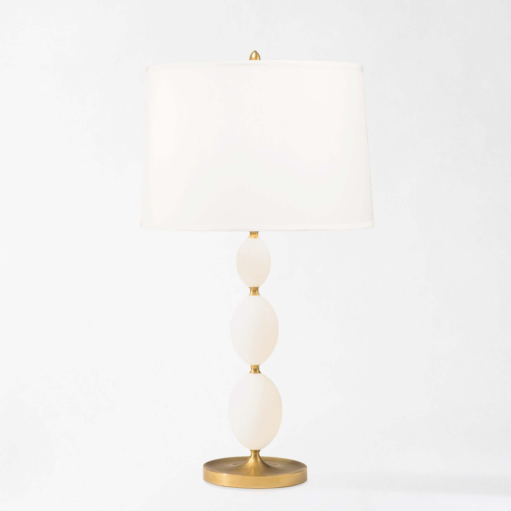 There is something quietly transcendent about alabaster — its ability to hold light as though it were alive. The Alabaster Table Lamp with Antique Brass Base celebrates that quality in its purest form: three perfectly rounded alabaster spheres stacked in graceful succession, each glowing from within like a captured moon. Designed by Ian K. Fowler, a name synonymous with modern refinement and sculptural clarity, this lamp embodies the balance between material honesty and enduring elegance.