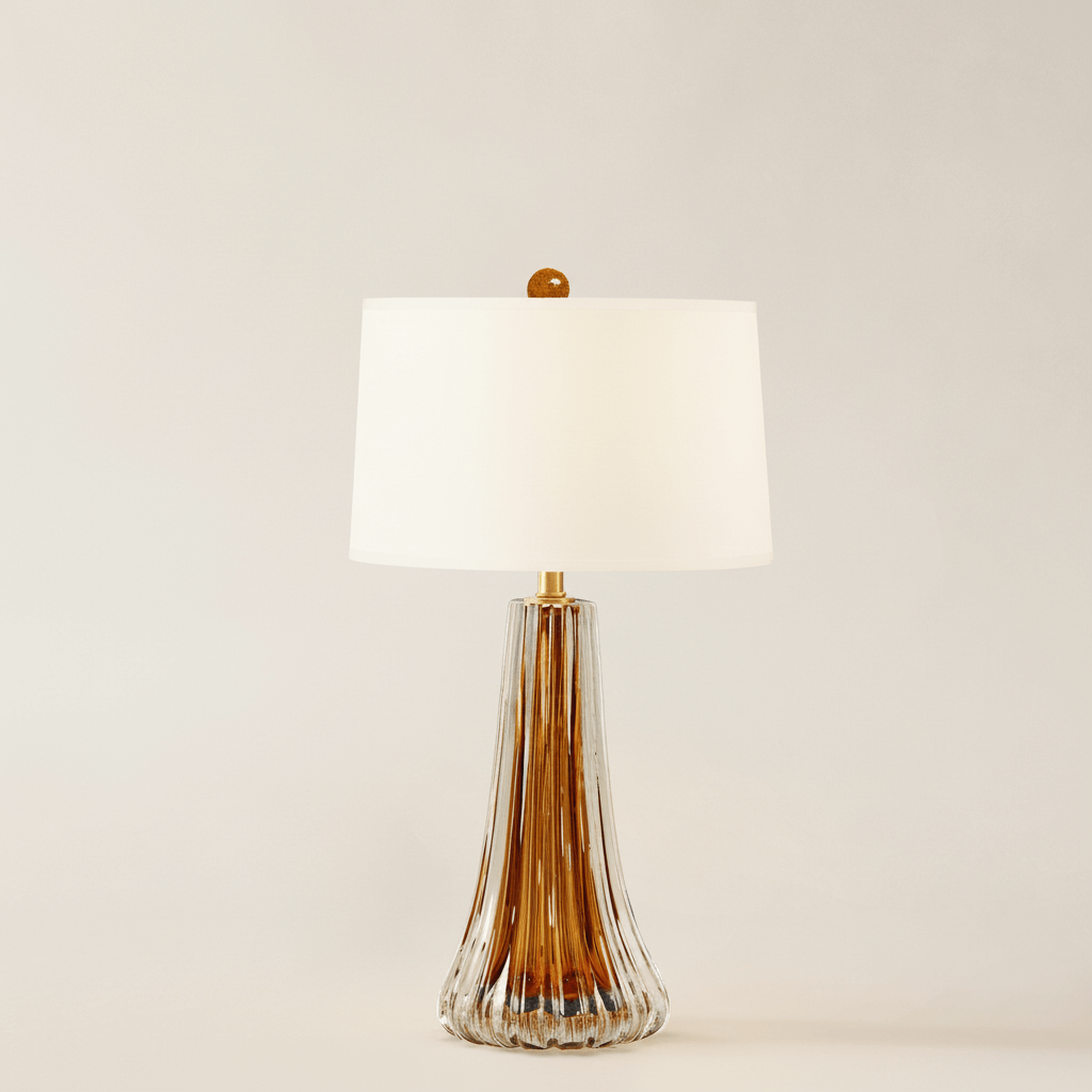 The table lamp’s base — tall, sculptural, and fluid — ripples upward like a cascade of molten amber. Subtle vertical fluting gives the surface texture and rhythm, refracting light through layers of transparent glass and casting a soft prismatic shimmer. At its crown, brushed brass fittings lend a refined accent, complemented by a crisp white linen shade that diffuses the light with quiet sophistication. The result is a composition that feels both timeless and cinematic — the kind of piece you might imagine glowing softly beside a velvet chaise in an Art Deco salon or illuminating a gilded bar cart in a 1950s Italian penthouse.