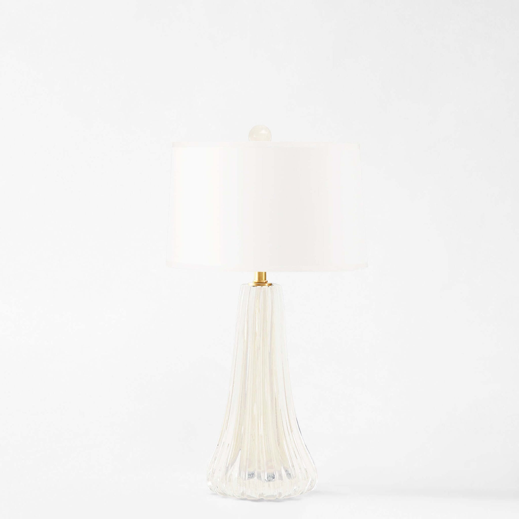 The lamp’s base, an elongated and fluted column of translucent white glass, captures and diffuses light with poetic softness. Every ridge in the glass serves as a channel for illumination, sending delicate ribbons of radiance through the material’s subtle rippling texture. The effect is ethereal — as though light itself had been sculpted into form. A simple white linen shade complements the purity of the glass, while brass fittings add a whisper of warmth, grounding the design in understated luxury.