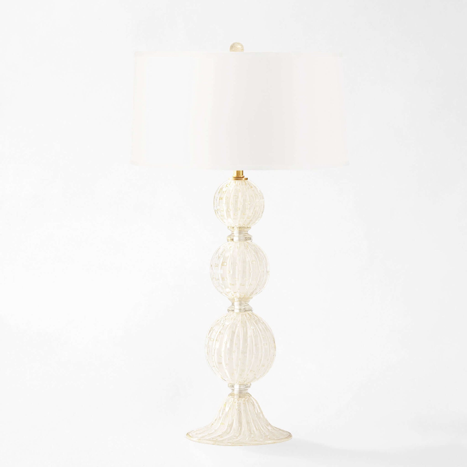 The lamp’s base is composed of three perfectly balanced glass orbs stacked in harmonious symmetry, each imbued with delicate 24-karat gold leaf suspended within the clear white Murano glass. When the light catches the embedded gold, it shimmers with a subtle warmth — not the brash shine of metal, but a diffused, glowing radiance reminiscent of Venetian sunlight reflecting across canal waters.