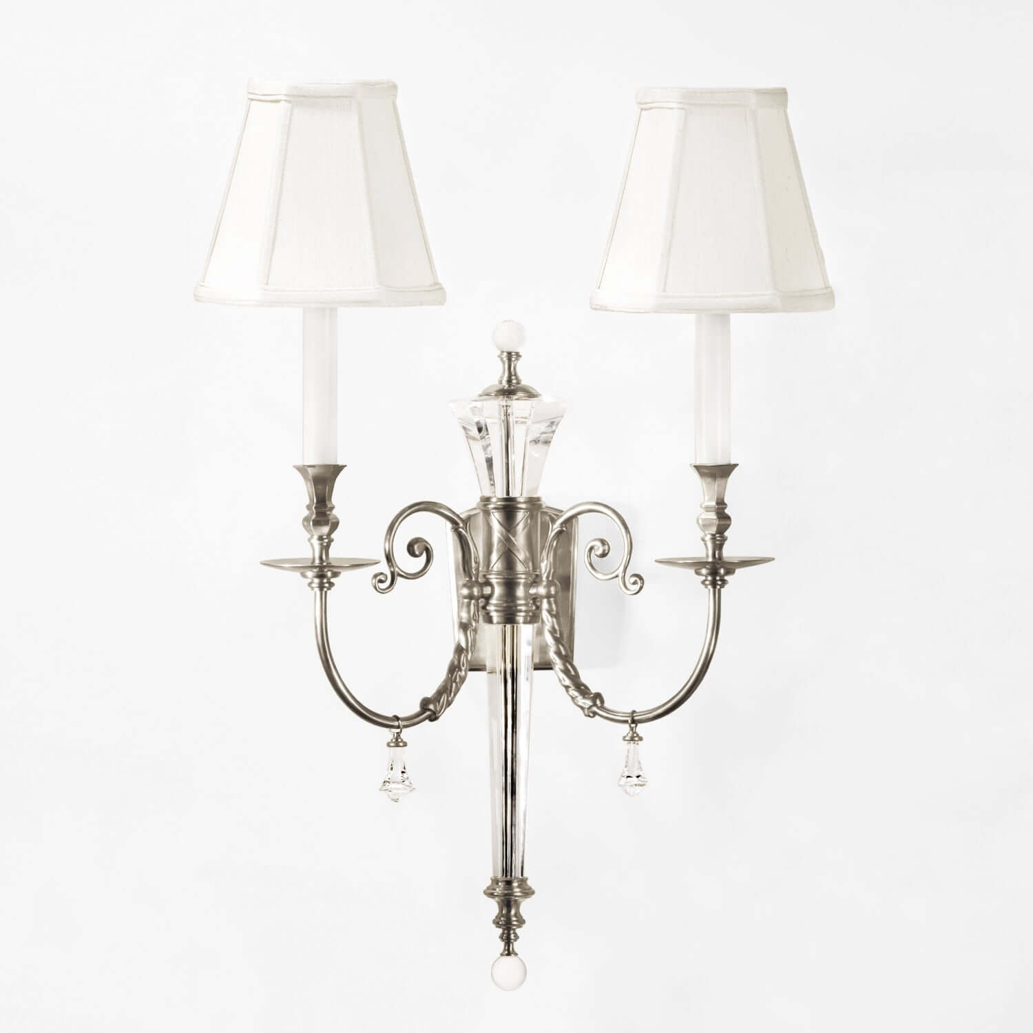 Each graceful curve of its double arms recalls the refined symmetry of neoclassical design. From the elegant scrollwork to the elongated finial, every detail speaks of balance and craftsmanship. At the heart of the design, a faceted crystal column glimmers beneath the polished nickel frame, refracting light into gentle prisms that dance softly across the wall. Two slender arms extend outward, each crowned with a candle-style socket and finished with ivory pleated shades that diffuse the glow into a serene, silken radiance.