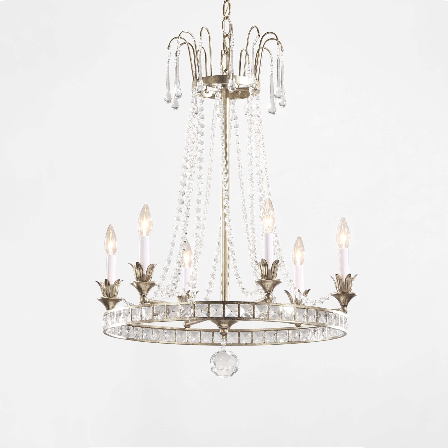 The antique silver leaf finish carries a gentle patina, reminiscent of moonlight brushing across aged Venetian mirrors. Its six candelabra-style lights rest within petal-like holders, evoking the tender elegance of blooming lilies. The flicker of each bulb glows softly through the clear crystals, scattering flecks of gold and silver onto nearby walls — a quiet alchemy that transforms light into atmosphere.