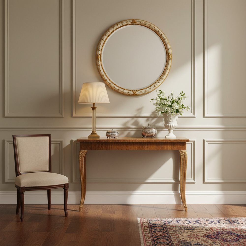 Mirrors here are both functional and decorative. A tall mirror beside the door allows a final glance before leaving, while also expanding the space. Above a console, a vintage mirror sets the tone for the entire home—welcoming guests with warmth and elegance.