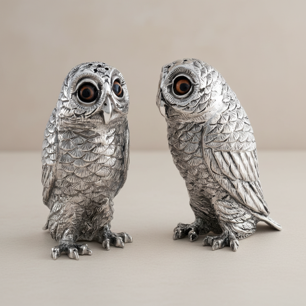 Even when not in use, these owls invite admiration. Displayed on a sideboard or nestled within a glass cabinet, they appear almost alive in their stillness, a reminder of the craftsmanship that transforms ordinary objects into heirlooms. There’s a faint echo of old-world England in their design — a nod to the pewter tankards, candleholders, and small curios that once filled country cottages and manor kitchens alike. And yet, their whimsy feels timeless, perfectly suited to a modern home that honors the past without being defined by it.