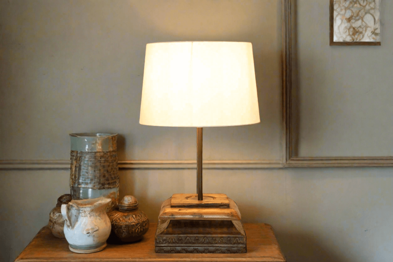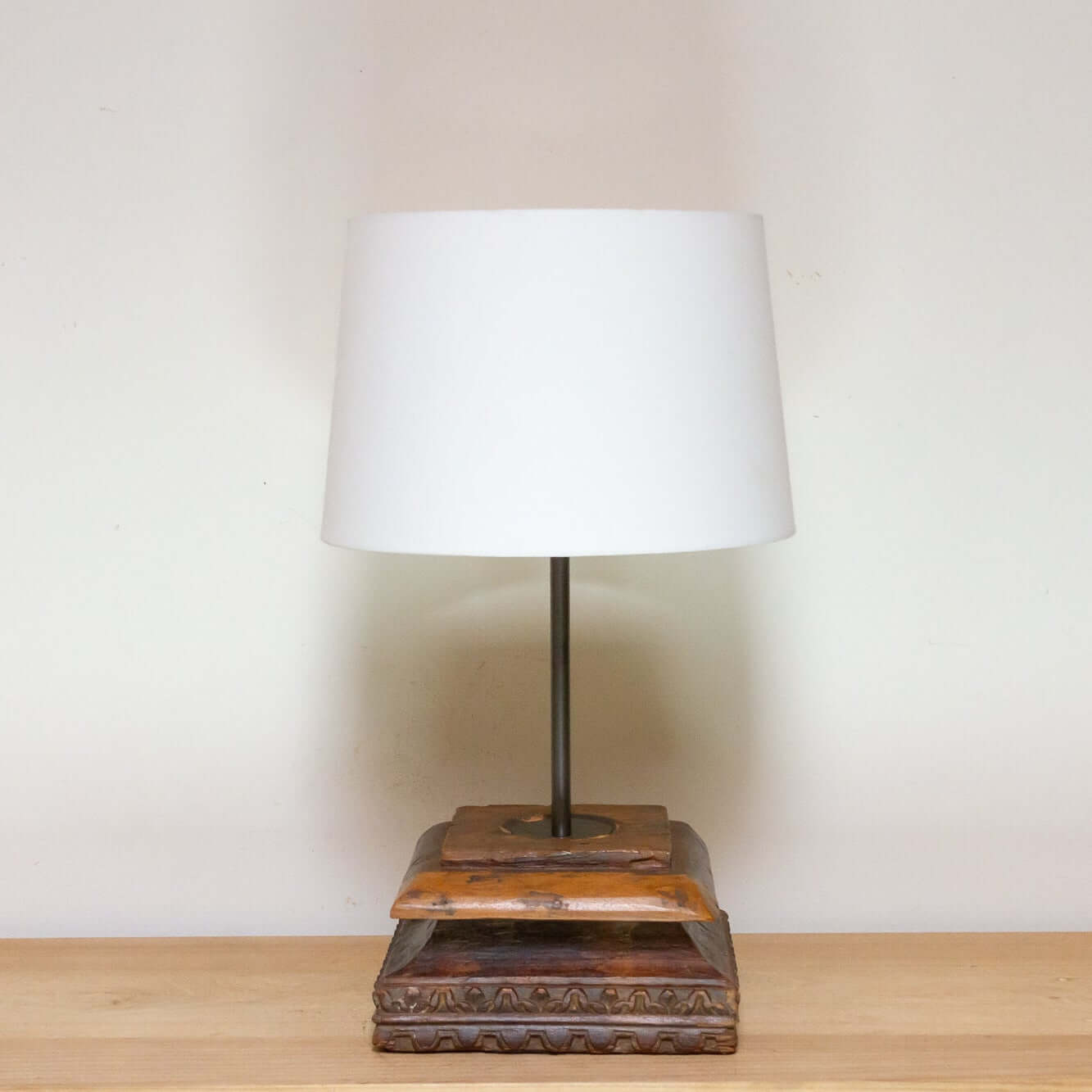 The Antique Indian Architectural Table Lamp is more than illumination — it is a piece of living history. Salvaged from the base of a grand haveli column in Rajasthan, this table lamp carries with it the whispered stories of 19th-century artisans, who carved stone and wood not merely for structure, but for devotion. The lamp’s teak base, with its layered cornices and ornamental detailing, once supported an architectural fragment that graced a noble Indian residence — a testament to the artistry of bygone craftsmanship.