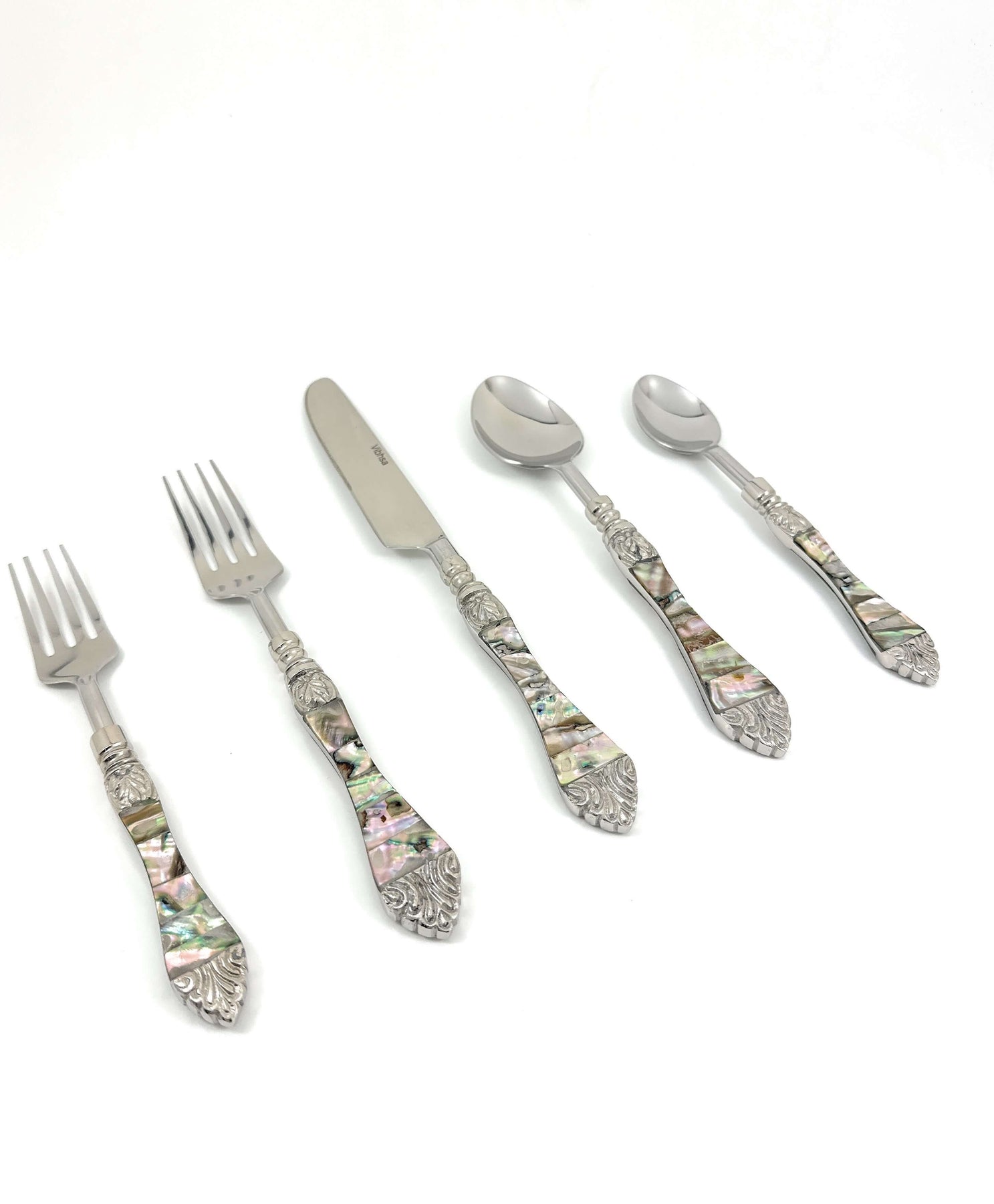 Beyond the table, this flatware set reflects the essence of Vintage Coastal style—a blend of elegance, natural textures, and seaside inspiration. The iridescent inlay recalls treasures gathered from the shore, while the intricate silver detailing at each end suggests craftsmanship from a bygone era. It makes a striking display in a dining cabinet, a thoughtful housewarming or wedding gift, or a cherished heirloom passed down to those who appreciate artistry in the everyday.