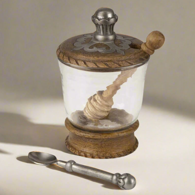 More than just a honey keeper, it is versatile enough to hold sugar, jam, mustard, or pickles—each transforming the jar into a little centerpiece of everyday joy. Its materials speak to the durability and artistry of the past: mango wood known for its rich grain, glass that reveals the beauty of its contents, and a pewter-toned metal lid that hints at old-world refinement.
