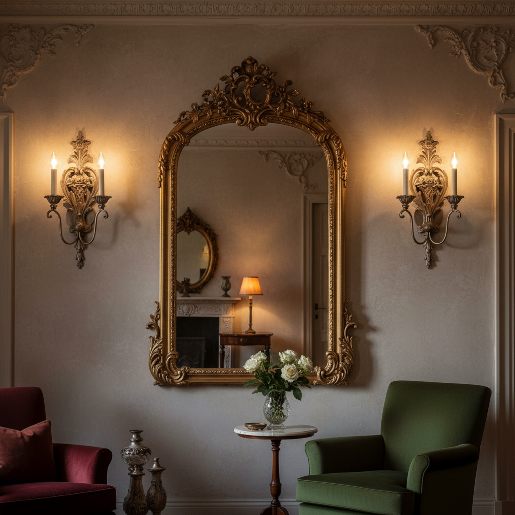 Imagine it gracing the paneled walls of a grand villa or illuminating a mirrored entryway — its twin candle-style lights casting a warm, flickering glow that brings architectural depth and texture to the room. The design embodies the French Country and Vintage Glamour sensibilities: ornate yet balanced, romantic yet refined. With every curve and flourish, it speaks of centuries-old craftsmanship and the Italian reverence for beauty in form.